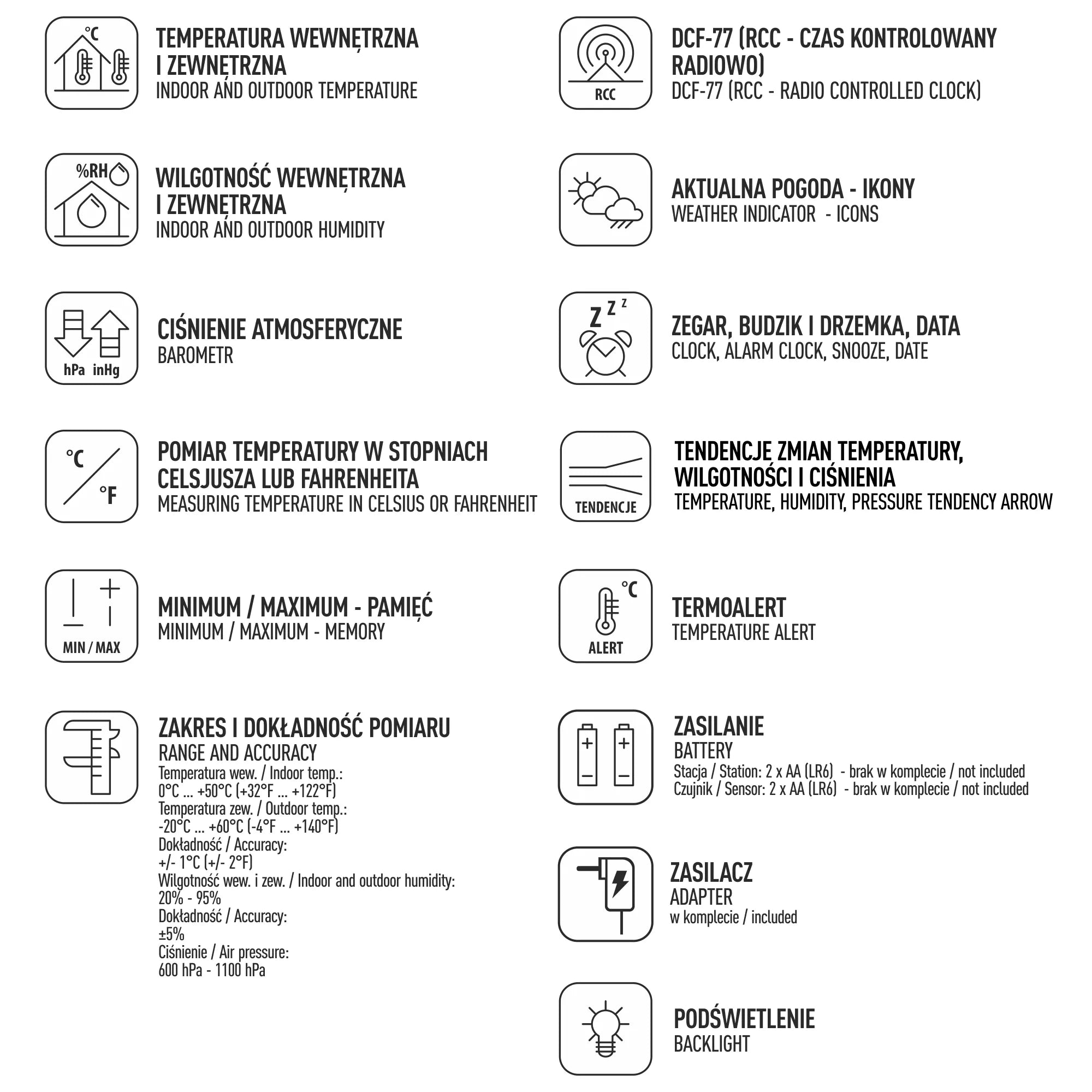 Šiuolaikiška, daugiafunkcė, belaidė orų stotelė leidžia tiksliai matuoti, įrašyti ir apdoroti duomenis, kad galėtumėte tiksliai įvertinti esamas atmosferos sąlygas tiek patalpoje, tiek lauke!