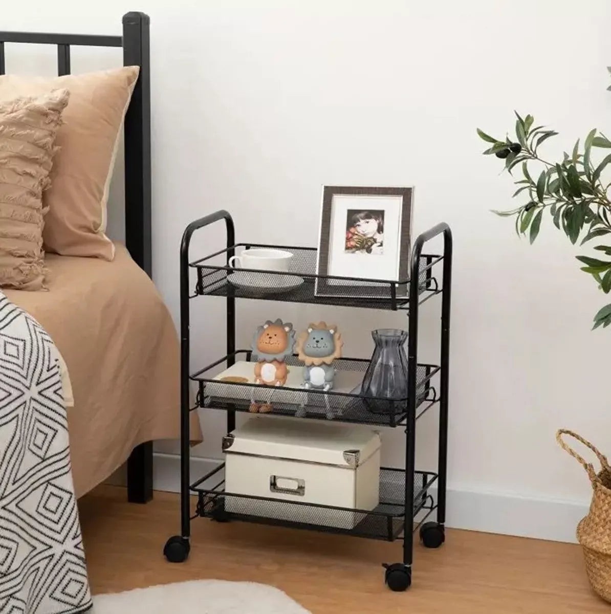 Universali, mobili virtuvės lentyna ant ratukų.Įrengtos trys gilios lentynos, kuriose telpa daug priedų.Papildomi penki nuimami kabliukai leidžia patogiai pakabinti šluostes ar rankšluosčius ant vežimėlio kraštų.Medžiaga: nerūdijantis plienas + plastikasLentynų skaičius: 3Viena ratų pora su stabdžiais.Atstumas tarp lentynų: 14,5 cmDidžiausia lentynos apkrova: 7 kgLentynos išmatavimai (vidiniai): 41 cm x 25 cm x 6 cmAukštis: 64 cmPlotis: 44 cmGylis: 26 cmJuoda spalvaPakuotė: kartonas