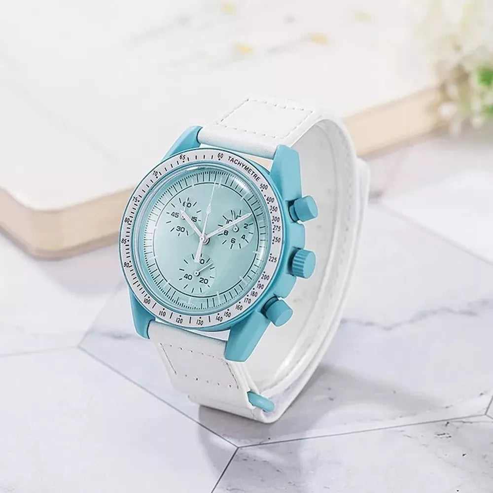 Šis laikrodis išsiskiria gaiviu ir moderniu dizainu – melsvas korpusas ir ciferblatas puikiai dera su baltu reguliuojamu dirželiu. Minimalistinė išvaizda papildyta dekoratyviniais subciferblatais, kurie suteikia sportiško stiliaus įspūdį.