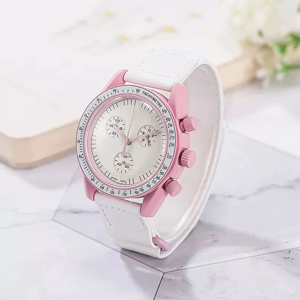 Moteriškas laikrodis su baltu dirželiu ir rožiniu korpusu