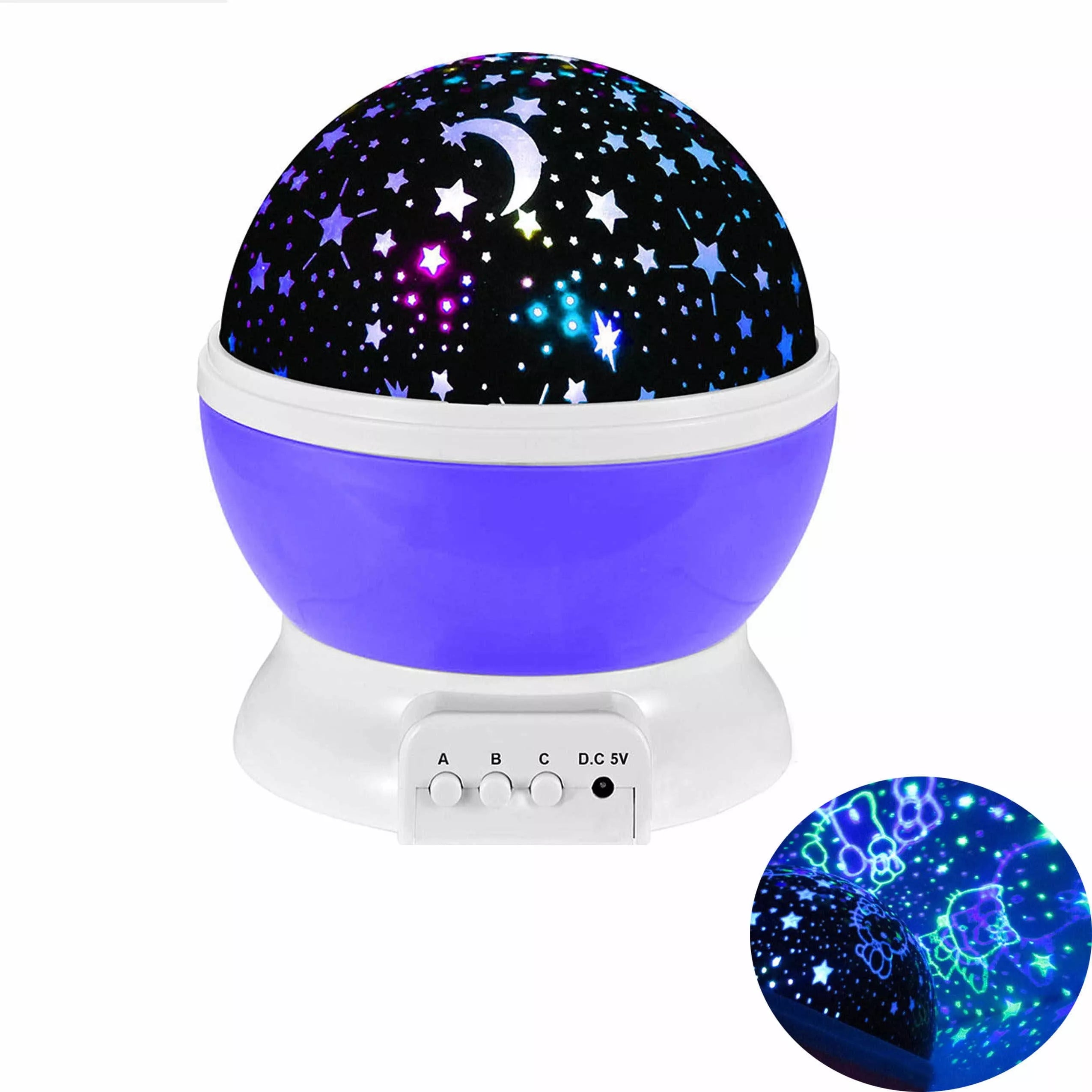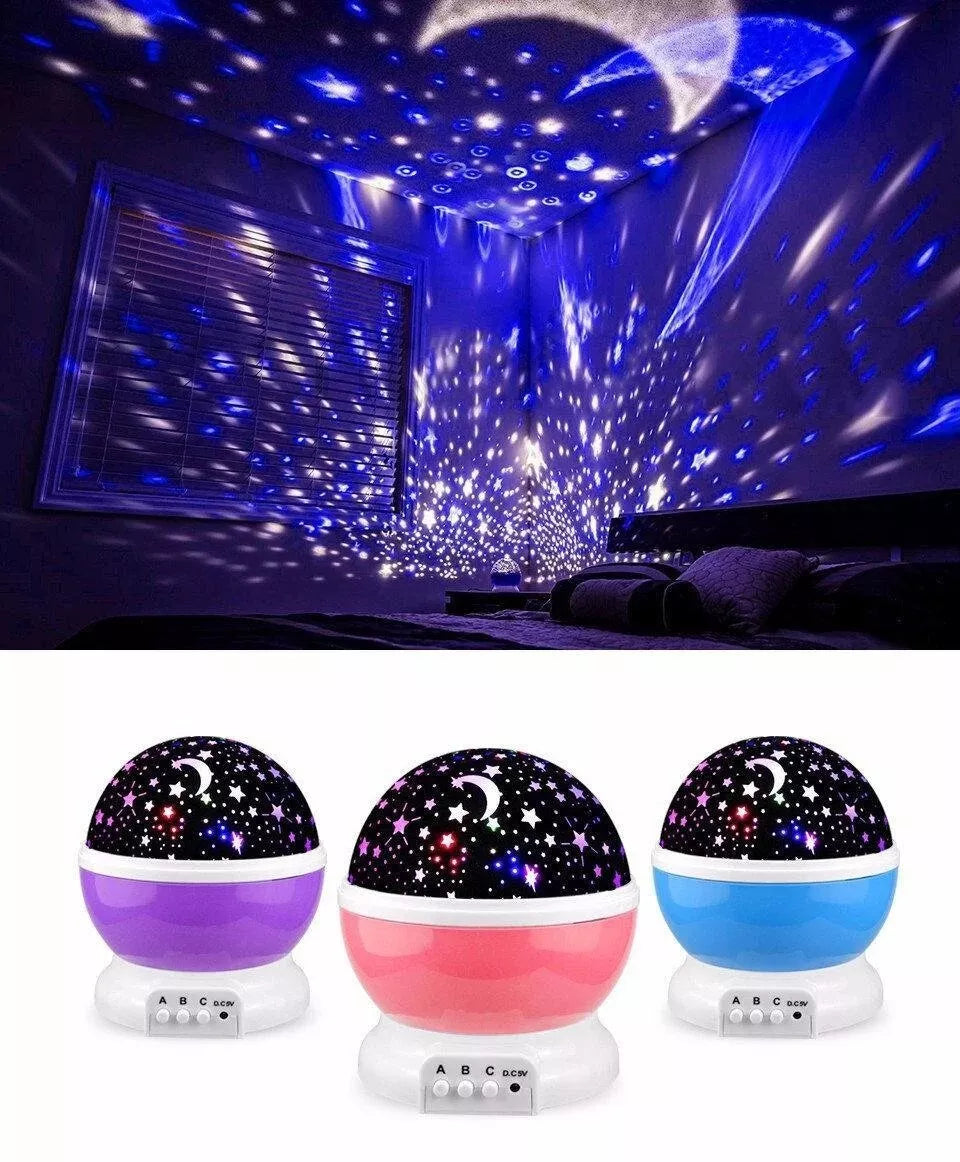 Pasirinkite LED lempos režimą, pakeiskite šviesos spalvas, kaip jums patinka, įjunkite 360 ° pasukimą arba sustabdykite projektorių. Prietaisas yra ideali dovana bet kokio amžiaus žmogui. Puikiai veikia kaip naktinė lemputė vaikui , skleidžianti malonią šiltą šviesą, o dėl naktinio dangaus projekcijos galimybės, vaikams miegas taps malonesnis. Čia yra įvairių šviesių spalvų derinių: šilta balta, mėlyna, žalia ir raudona. Maitinama dviem būdais: 4x AA baterijomis (nepridedama) arba USB laidu (DC 5V).