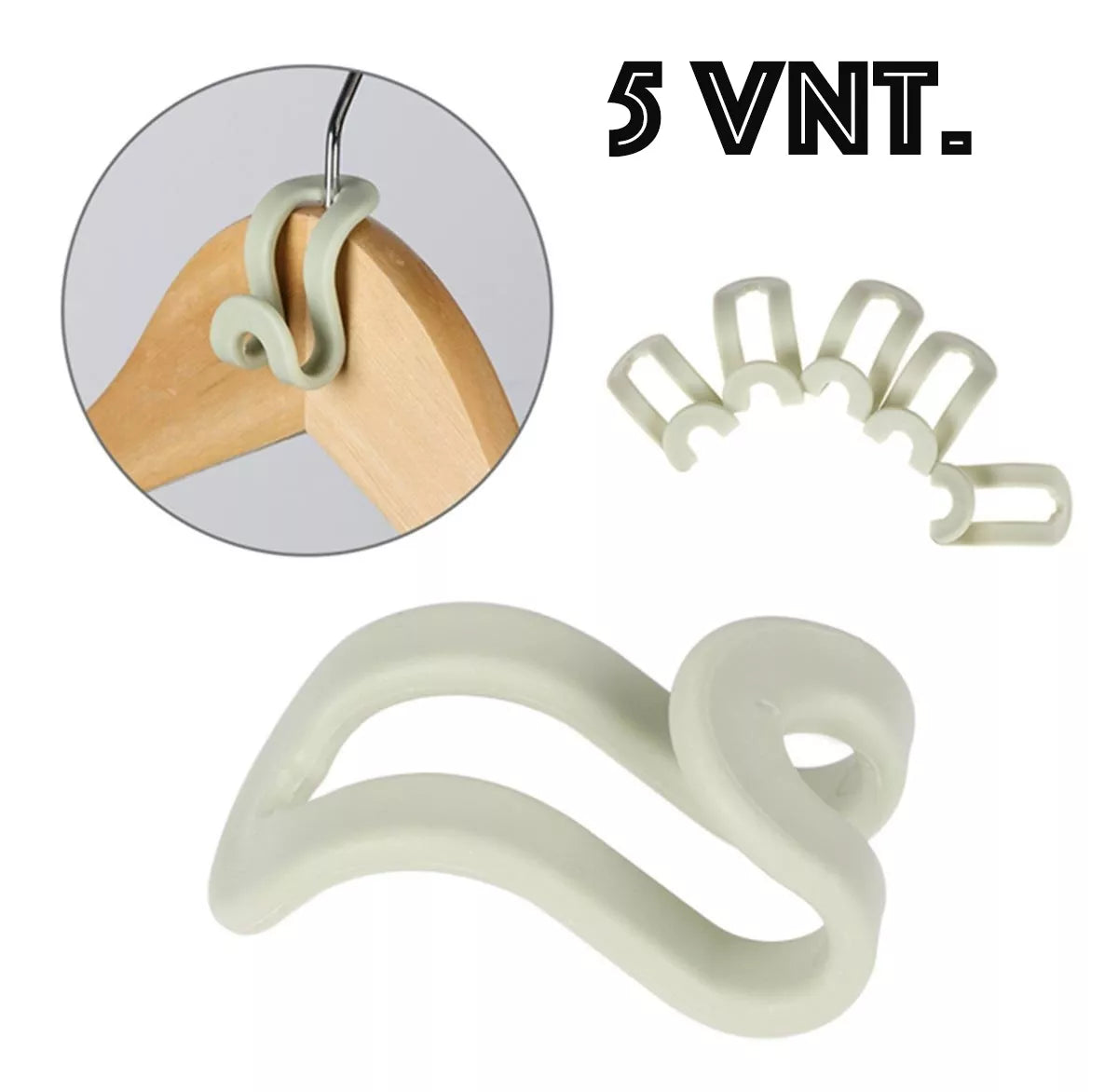 5 kabliukų rinkinys.Tai leidžia pakabinti iki 5 papildomų drabužių porų.Tai taupo vietą spintoje.Visiškai saugus - be aštrių briaunų.Medžiaga: plastikasMatmenys: aukštis 3,3 cm, plotis 2,4 cm