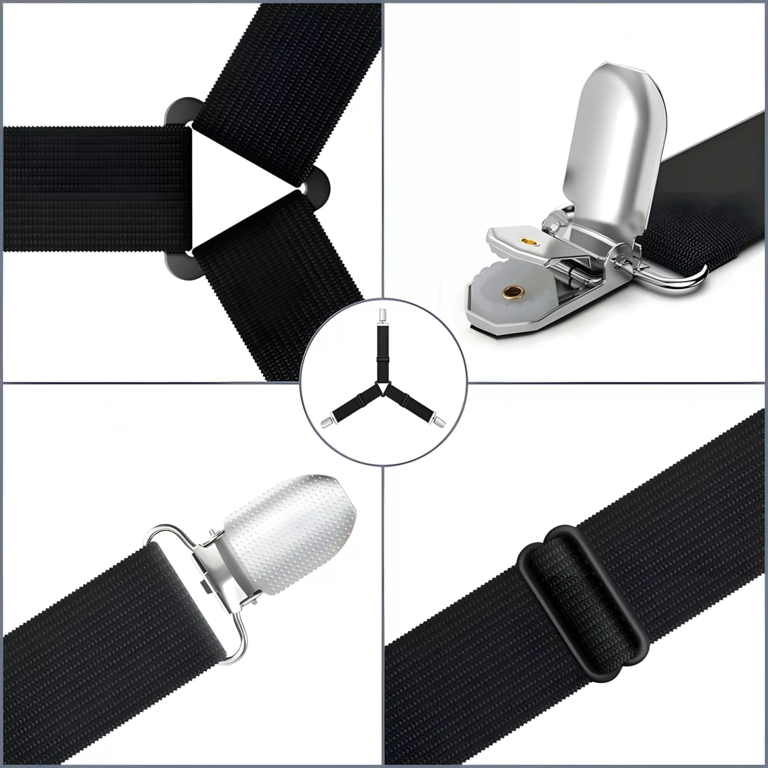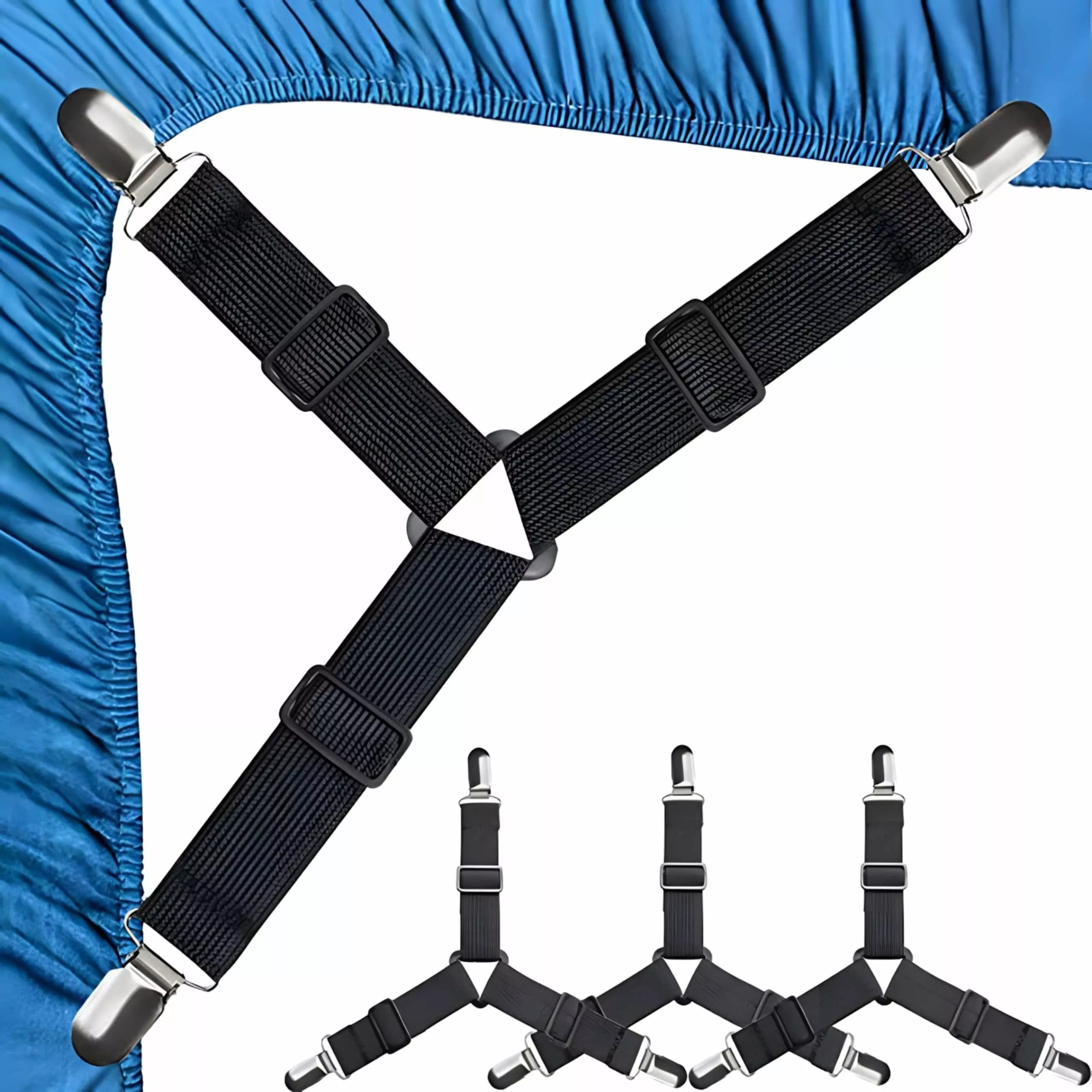 Reguliuojamo ilgio dirželiai leidžia lengvai pritaikyti juos prie įvairaus pločio čiužinių. Tvirti plieniniai spaustukai patikimai laiko paklodę vietoje ir apsaugo nuo jos nuslydimo nuo lovos.