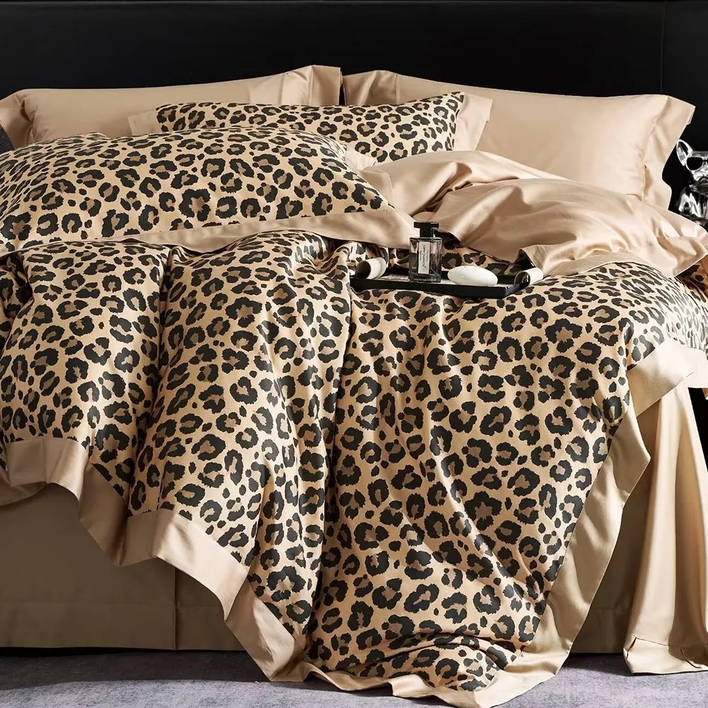 Prabangus patalynės komplektas su leopardiniu raštu – šilko ir medvilnės harmonija Jūsų miegamajam