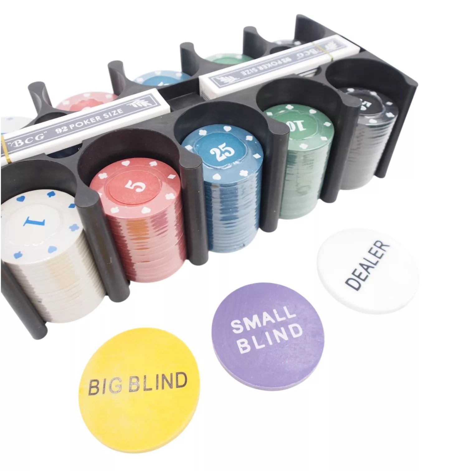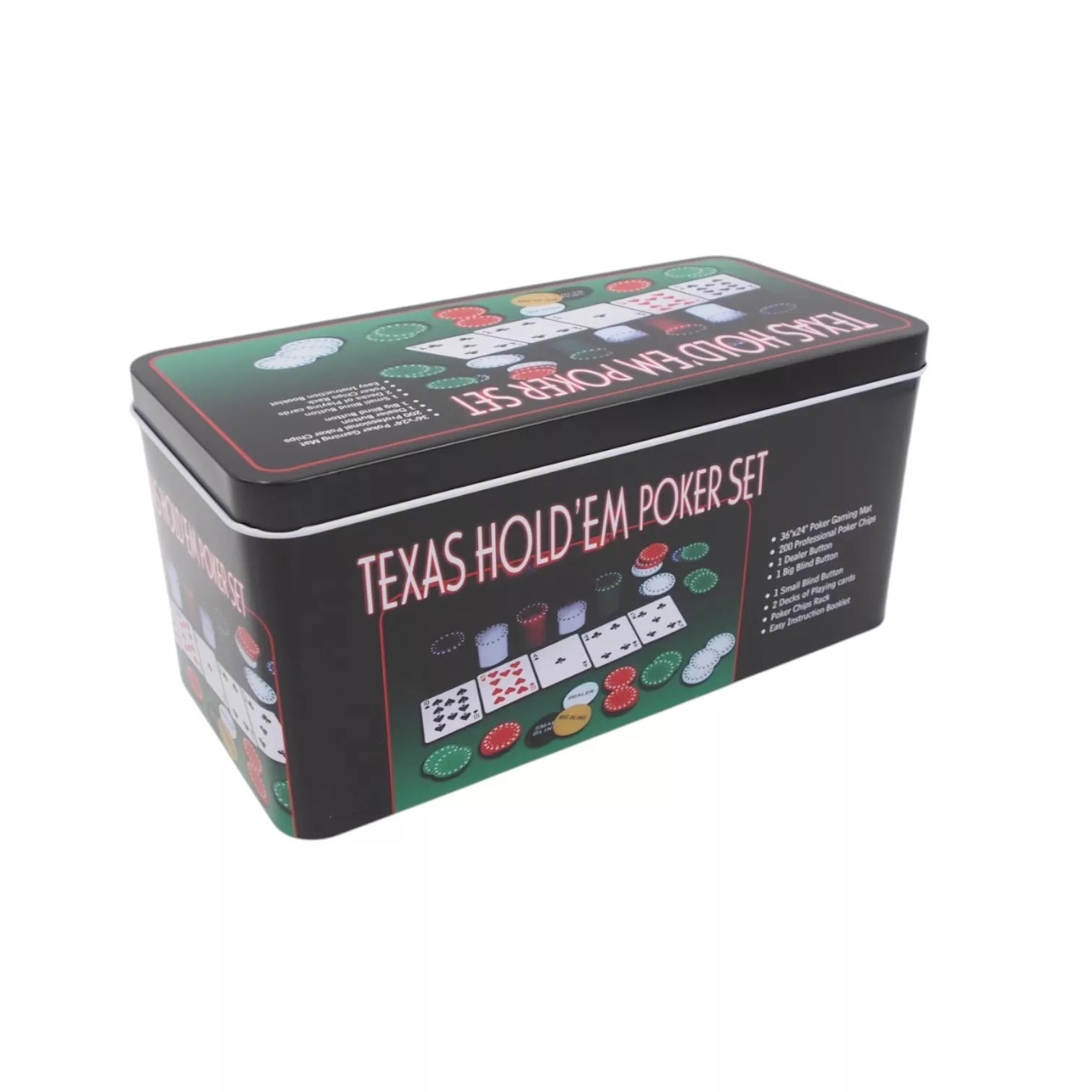 Sukurkite tikrą kazino atmosferą savo namuose su šiuo pilnu „Texas Hold'em“ pokerio rinkiniu! Elegantiška metalinė dėžutė saugo viską, ko reikia profesionaliam žaidimui – 200 žetonų įvairiomis vertėmis, 2 kaladės kortų, 1 dalintojo ženklas ir „Big Blind“ bei „Small Blind“ žetonai. Rinkinyje taip pat yra patogus žaidimų kilimėlis, kuris sukuria tikro pokerio stalo pojūtį. Tai puikus pasirinkimas vakarėliams, dovanai ar tiesiog kokybiškam laisvalaikiui su draugais.