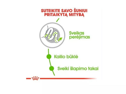 Išskirtinis maisto medžiagų derinys, padedantis palaikyti sveiką virškinimą (L.I.P. baltymai) ir subalansuotą žarnyno mikroflorą (prebiotikai). Labai mažai šuniukai yra linkę į vidurių užkietėjimą. Subalansuotas ląstelienos kiekis (įskaitant gysločių sėmenų luobeles) palengvina pašaro tranzitą žarnynu, todėl šunys sveikai tuštinasi.