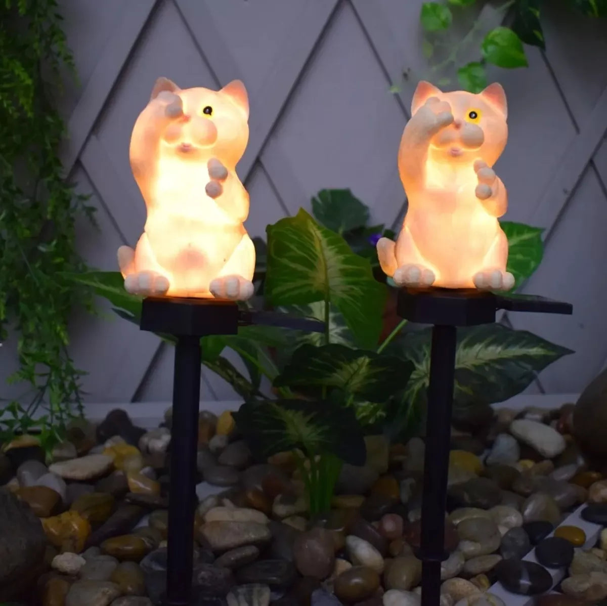 Neįprasta, saulės LED katės formos sodo lempa. Puikus dekoratyvinis elementas. Šviestuvas maitinamas saulės energija, o įmontuotai baterijai įkrauti naudojama saulės baterija. Prietaisas automatiškai įsijungia sutemus (yra įrengtas prieblandos jutiklis), o pilnai įkrautos baterijos užtenka iki 8 valandų nepertraukiamo veikimo. Šviestuvas turi LED diodą, skleidžiantį šiltai baltą šviesą. Tvirtas antgalis leidžia greitai ir saugiai sumontuoti lempą į žemę, o vandeniui atsparus korpusas garantuoja sklandų naudojimą nepaisant oro sąlygų.