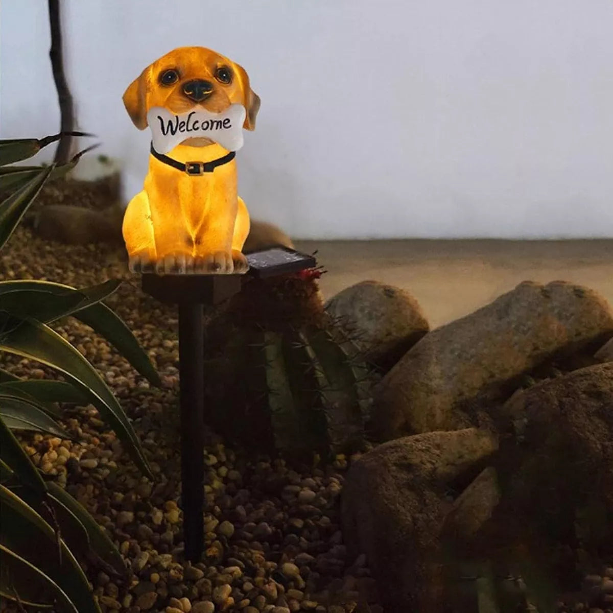 Neįprasta lempos forma – šuo su kaulu burnoje.Jis maitinamas saulės energija iš polikristalinės plokštės (kuri įkrauna įmontuotą bateriją).Integruota baterija dienos metu įkraunama saulės spinduliais. Energijos rezervas leidžia lempai ilgai veikti naktį. Pilnai įkrauta baterija leidžia lempai nepertraukiamai veikti 6–8 valandas.Puikiai tinka apšviesti sodus, takus ar laiptus. Dėl saulės baterijos lempai nereikia nuolat keisti baterijų ir praktiškai nereikia priežiūros!Naudojamas šviesos diodas užtikrina neutralų baltą foninį apšvietimą.Įrengtas automatinis prieblandos jungiklis (prieblandos jutiklis).Nereikia vesti elektros laidų prie lempos.Labai lengva montuoti – tereikia įsmeigti lempos galiuką į žemę.Lempa atspari besikeičiančioms oro sąlygoms. Turi vandeniui atsparų korpusą.Specifikacija: