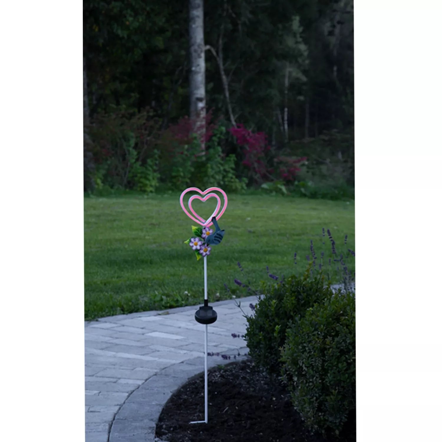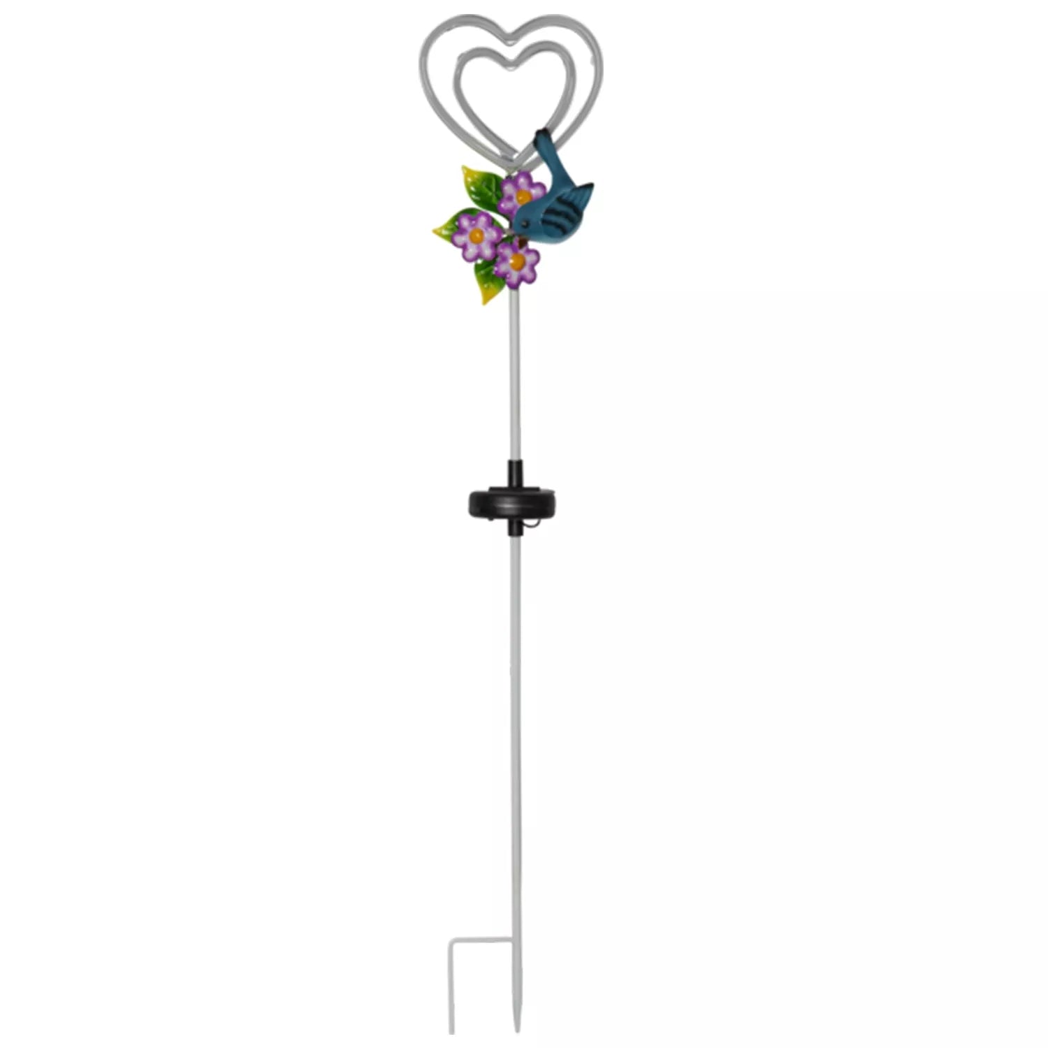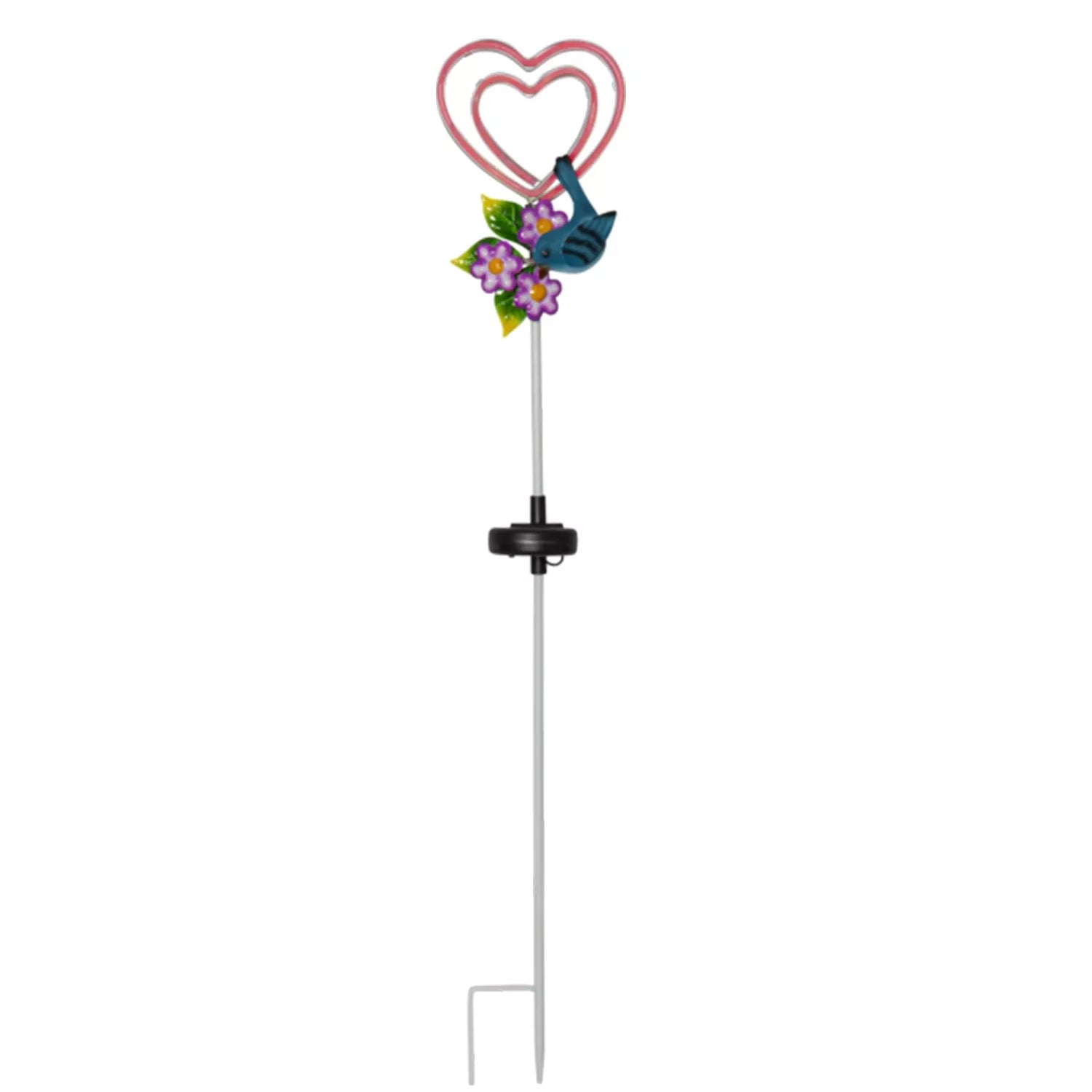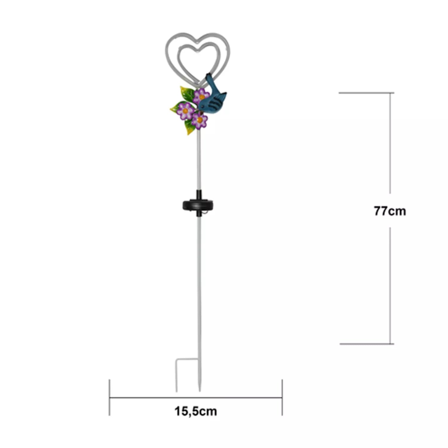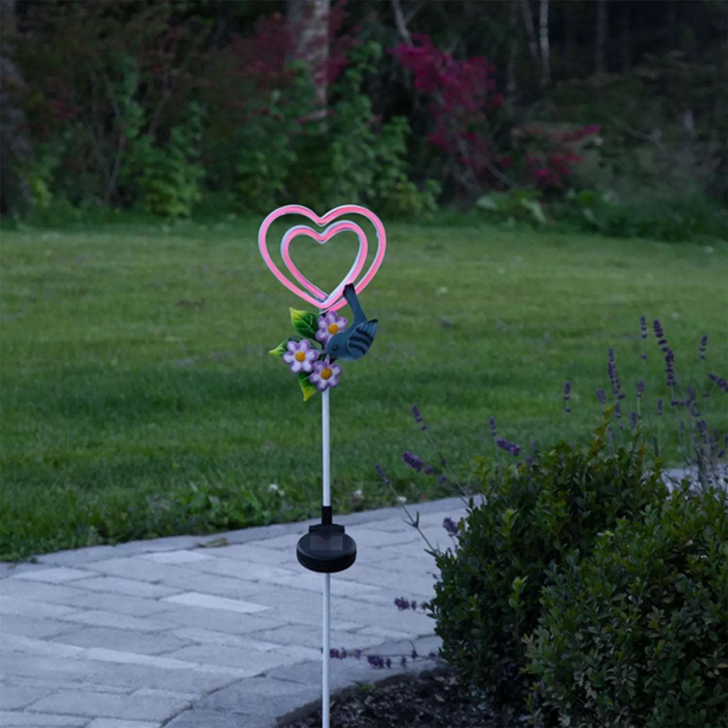 Romantiškas LED šviestuvas sodo ar kiemo dekoravimui, puošiamas širdies kontūru ir mielu paukšteliu ant gėlės. Šviesus rožinis švytėjimas sukuria jaukią atmosferą sutemus.