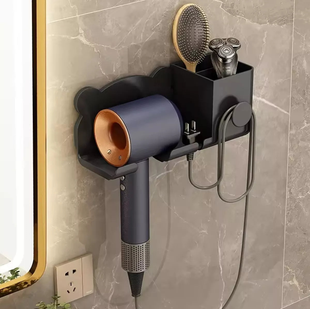 Sieninis laikiklis plaukų džiovintuvui. Itin patogus sprendimas ir puikiai taupantis erdvę.