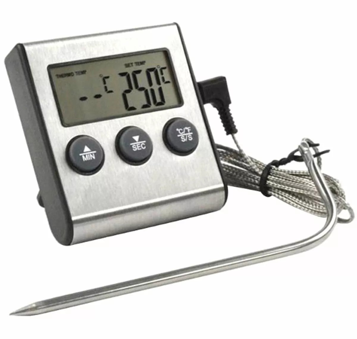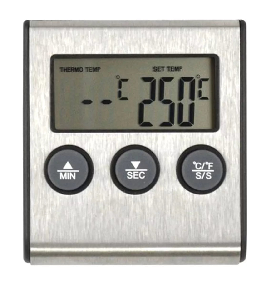 Elektroninis termometras su karščiui atspariu zondu. Puikiai tinka temperatūrai matuoti ant grotelių, rūkykloje ir dujinėse bei elektrinėse orkaitėse. Būtinas, kai viryklėje nėra įmontuoto temperatūros indikatoriaus. Prietaisas turi aiškų LCD ekraną, kuris palengvina matavimų skaitymą. Ilgas laidas ir karščiui atsparus smaigalio formos zondas leidžia lengvai įdėti jį net į maistą ir išmatuoti mėsos temperatūrą. Termometras taip pat turi iki 99 minučių skalės laikmatį ir garsą, signalizuojantį, kad laikas praėjo ir pasiekiama deklaruota temperatūra. Šis puikus įrankis leis daug lengviau kontroliuoti kepamo maisto temperatūrą.