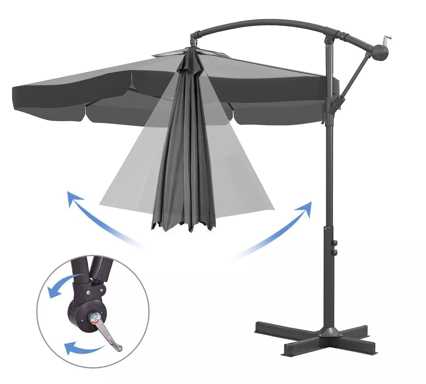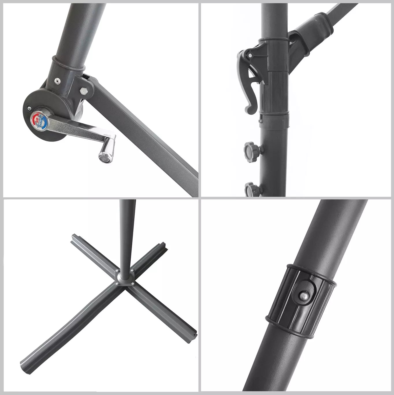 Skėtis su strėle, pagamintas iš oro sąlygoms atsparaus poliesterio. Aukščiausios kokybės medžiaga puikiai apsaugo nuo saulės spindulių. Įrengtas alkūninis mechanizmas. Greitas skėčio sulankstymas/išskleidimas. Skėtis turi būti pasvertas arba prisukamas prie žemės, priešingu atveju kyla pavojus, kad vėjas sugadins skėtį. Garantija netaikoma žalai, kurią sukėlė gūsingas vėjas.