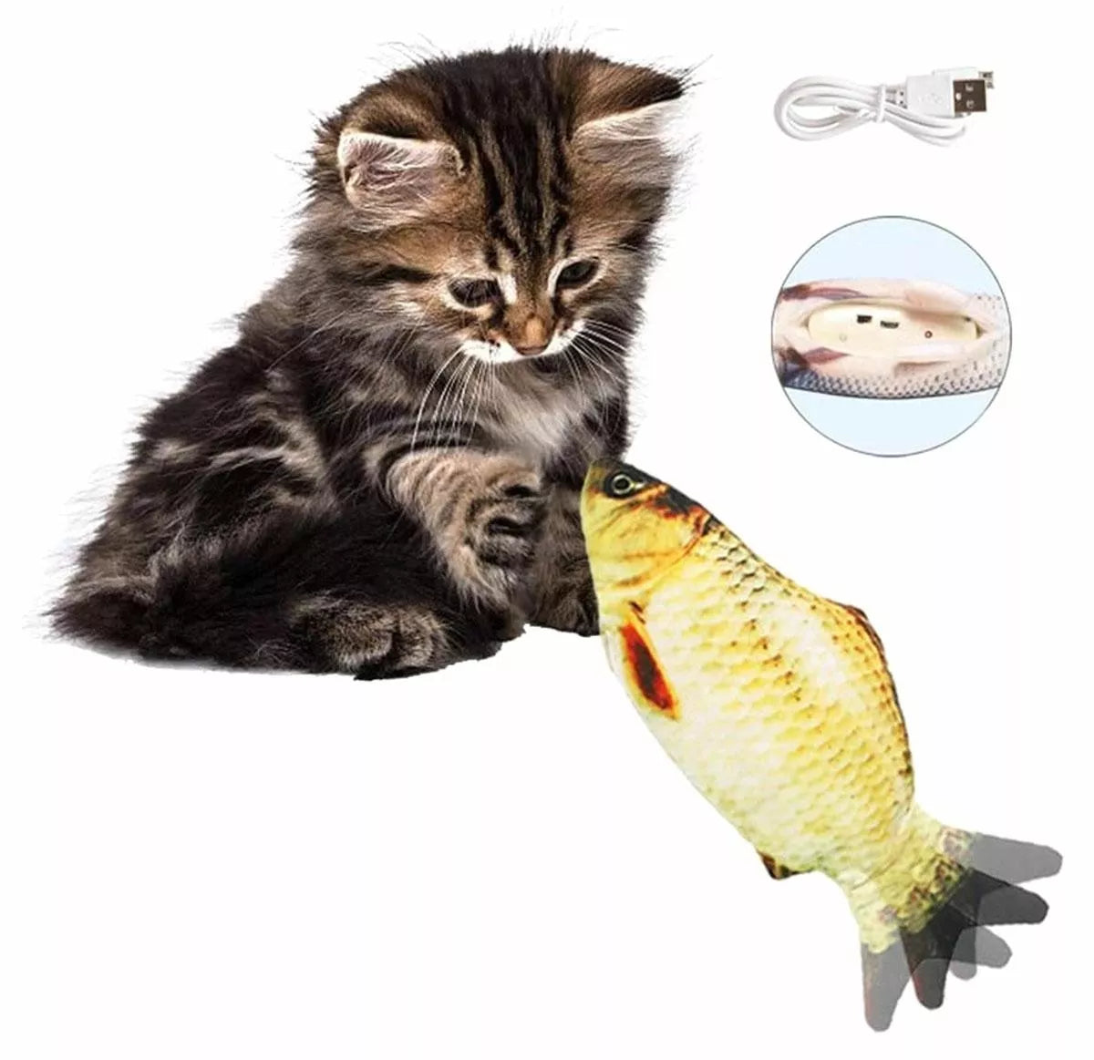 Šokinėjanti žuvis - puikus žaislas kiekvienai katei. Pagaminta iš minkštos, gyvūnams saugios medžiagos (medvilnės ir pliušo), imituojanti tikros žuvies formą, svorį ir matmenis. Žaislą maitina įmontuota baterija, kurią įkrauname patekę į paslėptą žaislo viduje esantį USB prievadą. Žuvį galima išardyti, viršutinę dalį galima nuplauti pašalinus elektroniką.