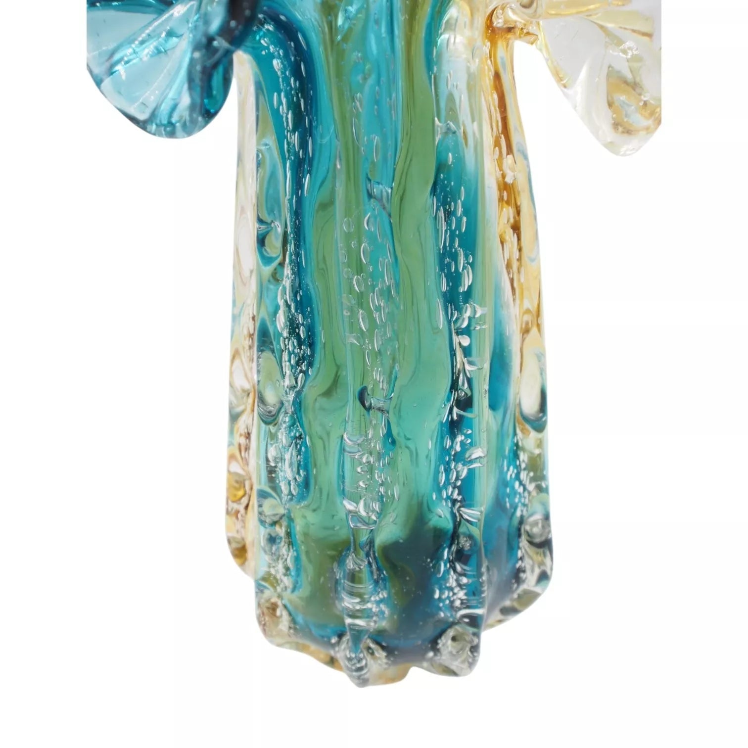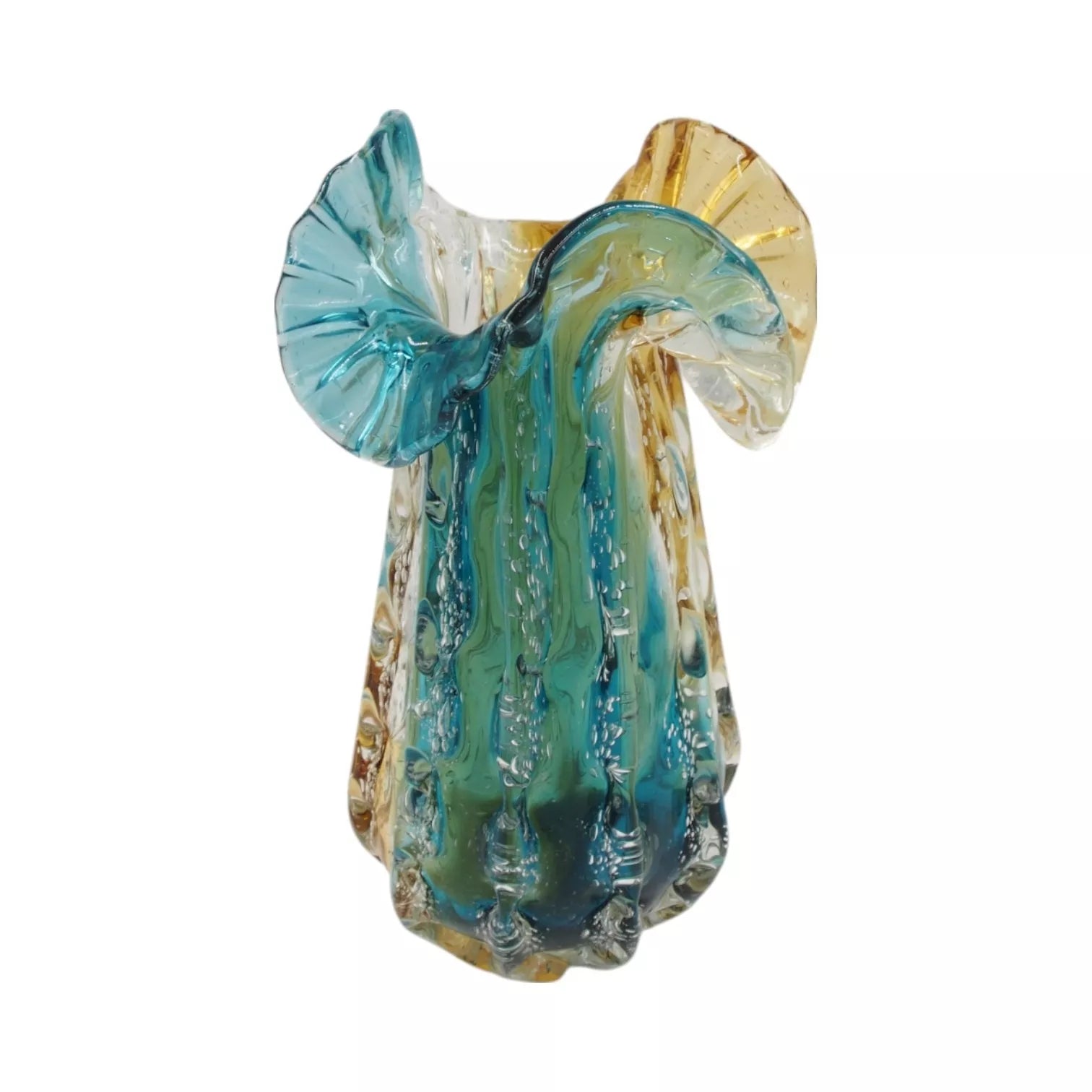 Įspūdinga, unikali vaza iš spalvoto stiklo – išskirtinis interjero akcentas, derinantis meninį dizainą ir funkcionalumą. Bangos formos kraštai bei perėjimai tarp mėlynų, žalių ir gelsvų atspalvių sukuria įspūdingą šviesos žaismą. Tinka tiek šviežioms gėlėms, tiek kaip savarankiška dekoracija.