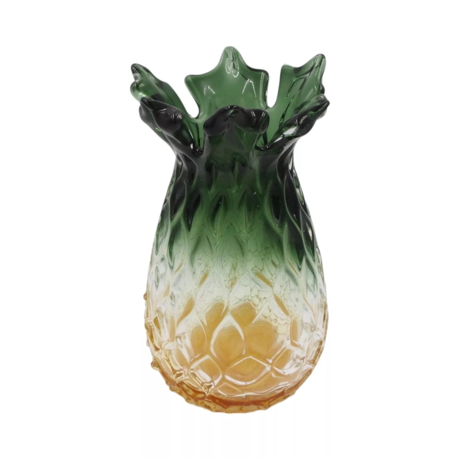 Unikalaus dizaino stiklinė vaza, savo forma ir spalvomis primenanti prinokusį ananasą, taps ryškiu interjero akcentu bet kuriuose namuose. Derinys žalios ir gintaro spalvų bei tekstūruotas paviršius sukuria išskirtinę estetiką, traukiančią akį.
