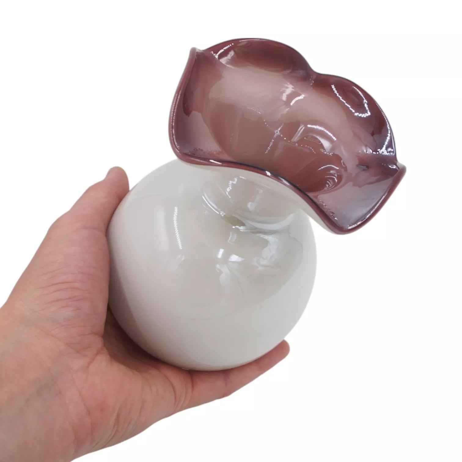 Ši elegantiška vaza išsiskiria savo unikaliu dizainu – baltas blizgus pagrindas derinamas su banguotu tamsiai raudonu kraštu, primenančiu žiedlapių formą. Pagaminta iš kokybiško stiklo, ši vaza taps ryškiu interjero akcentu ir puikiai tiks tiek šviežioms, tiek dirbtinėms gėlėms eksponuoti.