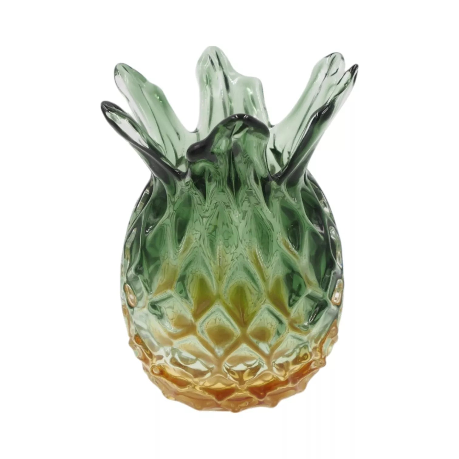 Ši išskirtinė stiklinė vaza, atkurianti prinokusio ananaso formą, neabejotinai taps pagrindiniu akcentu jūsų interjere. Tamsiai žalias viršus ir pereinanti geltona spalva sukuria natūralią, vasarišką estetiką, o kruopščiai išformuotas paviršius žaismingai atspindi šviesą.