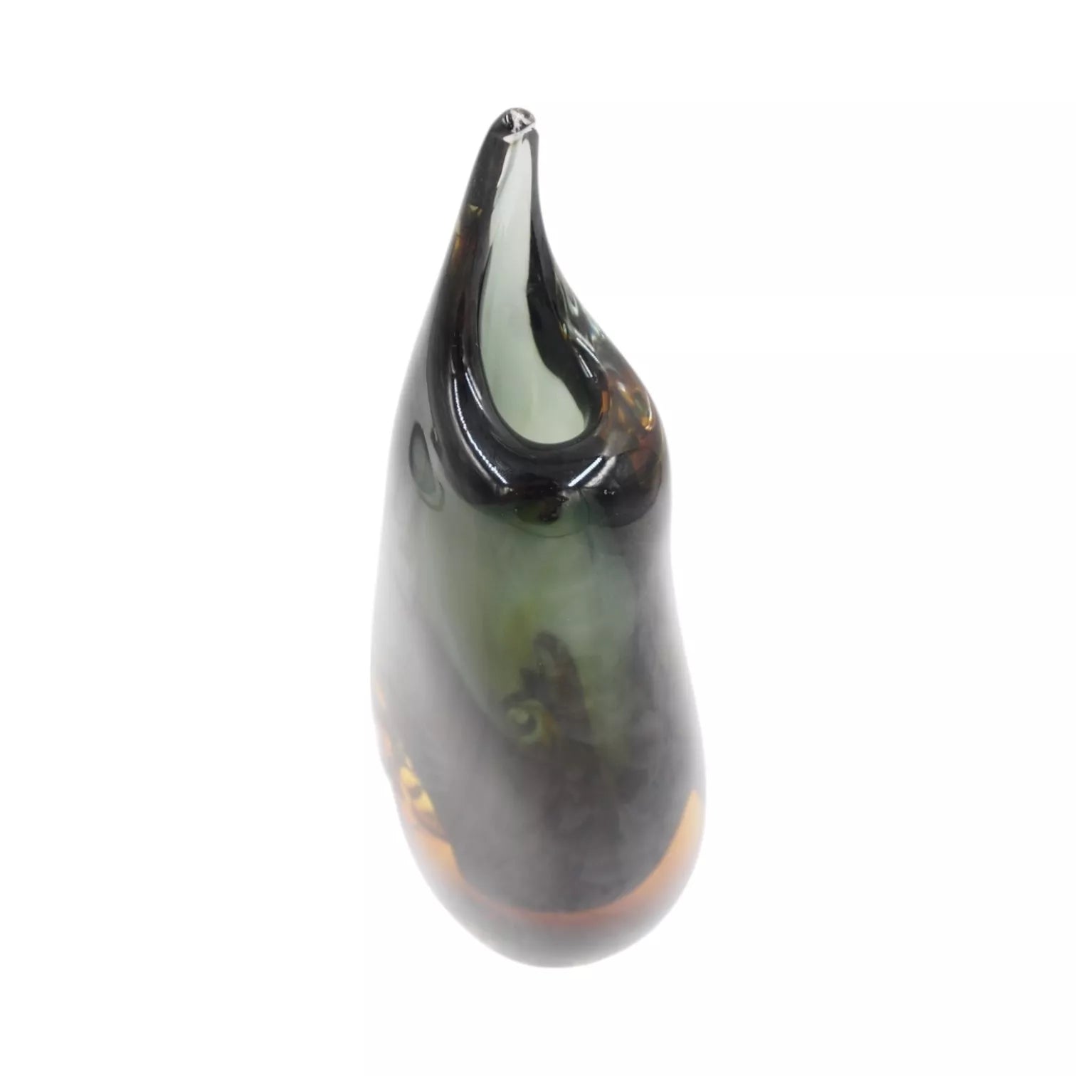 Išskirtinio dizaino rankų darbo stiklinė vaza iš kolekcijos Forma Lumo – kai stiklas įgauna šviesos formą. Šis kūrinys pasižymi elegantiškomis linijomis, harmoningai susiliejančiomis gintaro, tamsiai žalios ir skaidrios spalvos detalėmis.