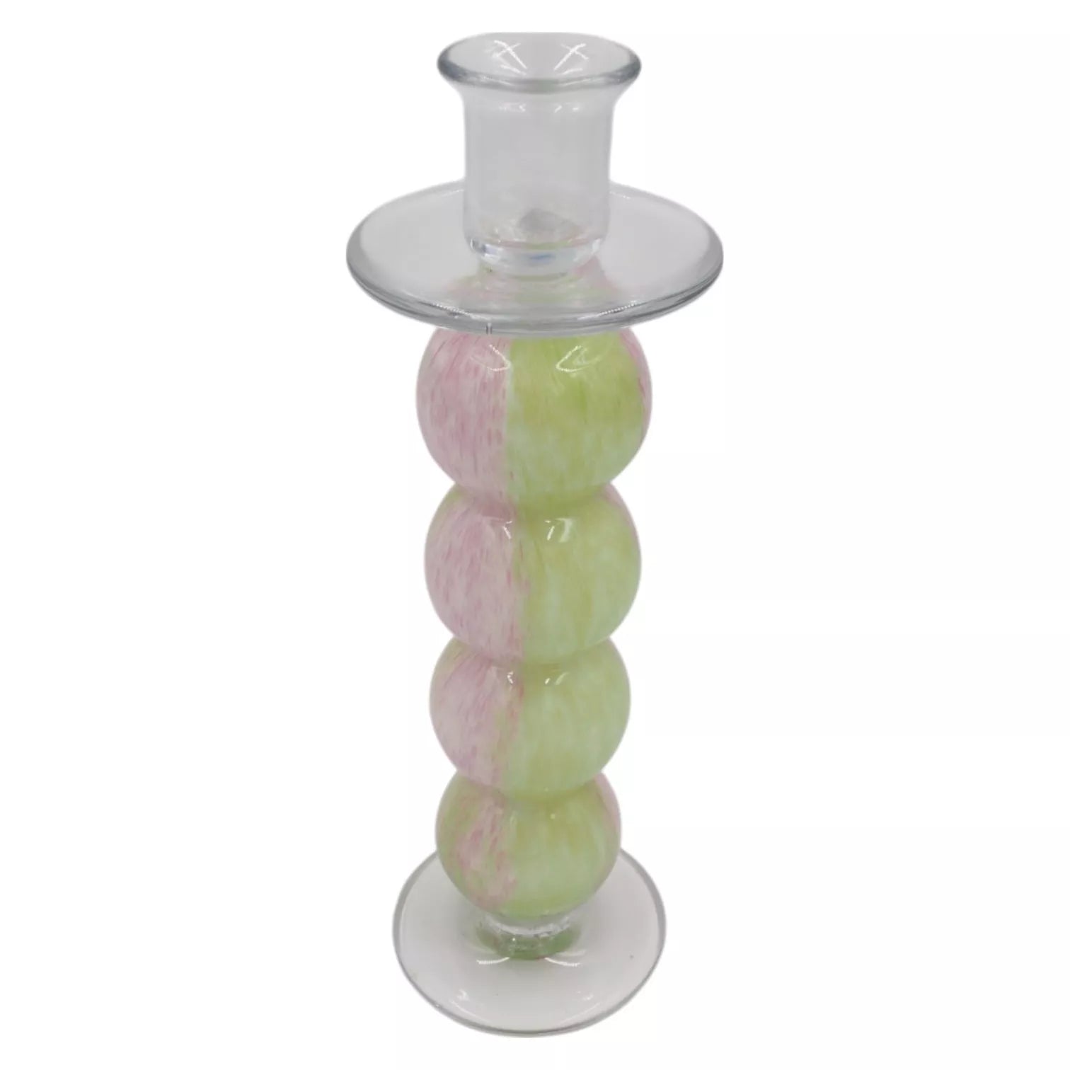 Išskirtinio dizaino stiklinė žvakidė su subtiliu spalvų deriniu – švelniai žalia ir rožinė susilieja į dekoratyvų burbulų formos stulpelį. Aukšta, elegantiška forma puikiai tinka klasikiniam ar moderniam interjerui. Žvakidė ne tik skleidžia šviesą, bet ir tampa stilinga akcentine detale ant stalo, lentynos ar palangės.