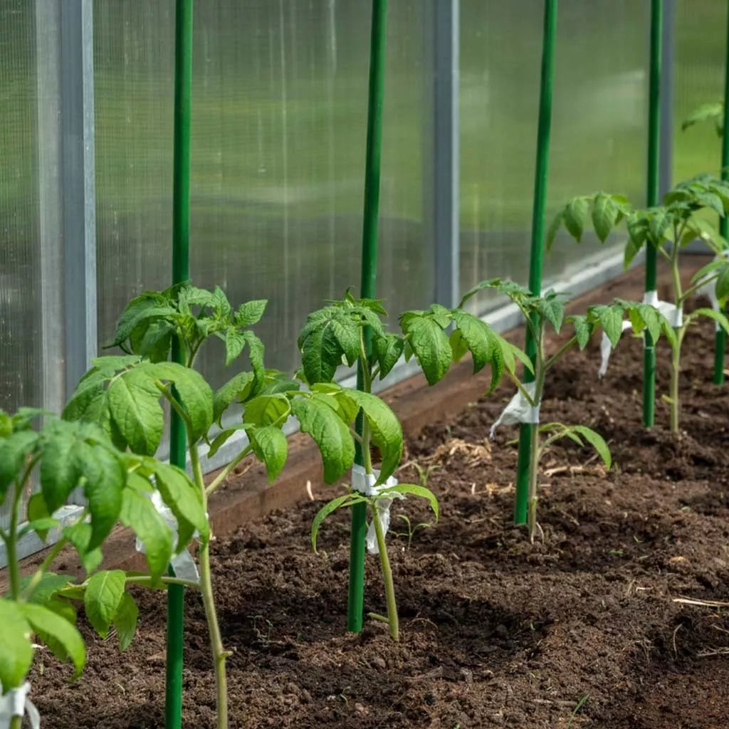 Pomidorų kuoliukai pagaminti iš metalo, padengto žaliu plastiku.