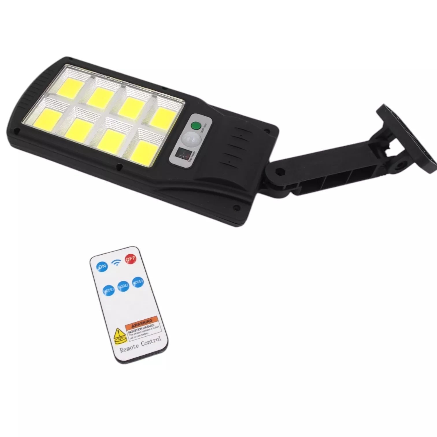 Saulės energija įkraunamas lauko LED šviestuvas su judesio jutikliu ir pulteliu