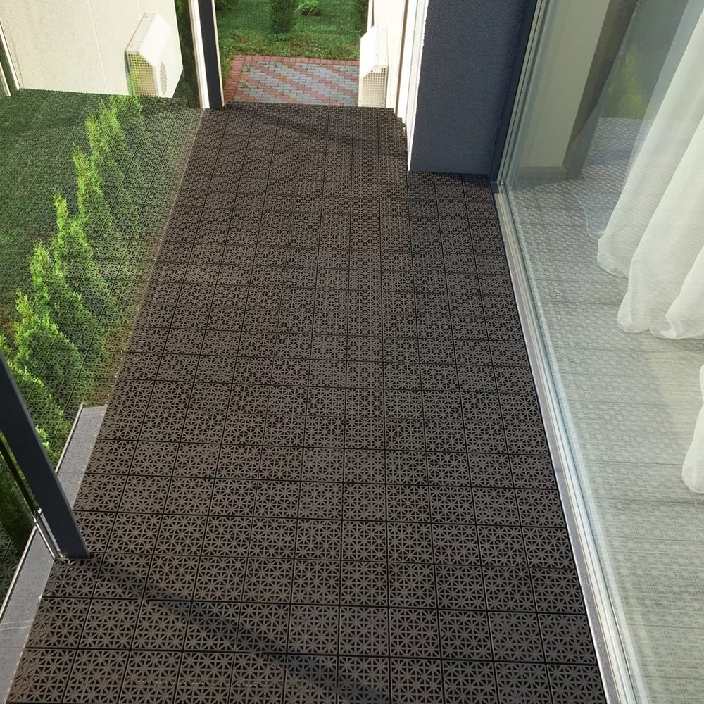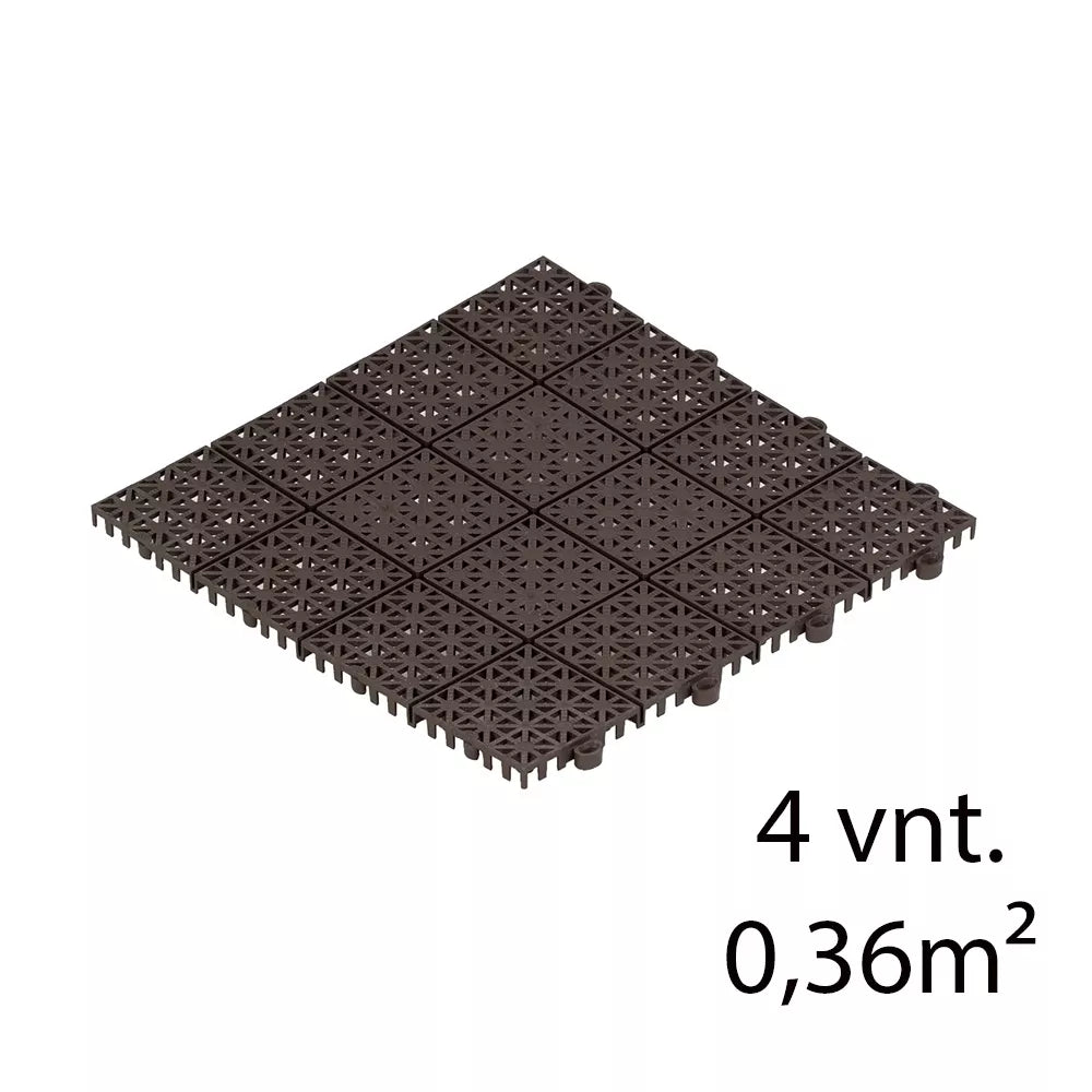 Išmatavimai: 30.6 cm x 30.6 cm x 1.2 cm. (vienos plytelės)Spalva: ruda.Rinkinį sudaro: 4 vnt. (0,36m2).Plytelės pagamintos iš 100% perdirbto plastiko.Neblunka saulėje, atsparios vandeniui ir šalčiui.Lengvas sumontavimas ir išmontavimas, kuriam nereikalingi jokie papildomi įrankiai.Paprastas plytelių jungties dizainas.Norint uždengti visą reikiamą plotą, plyteles galima siaurinti – plytelę tiesiog rankomis laužti per lenkimo liniją.