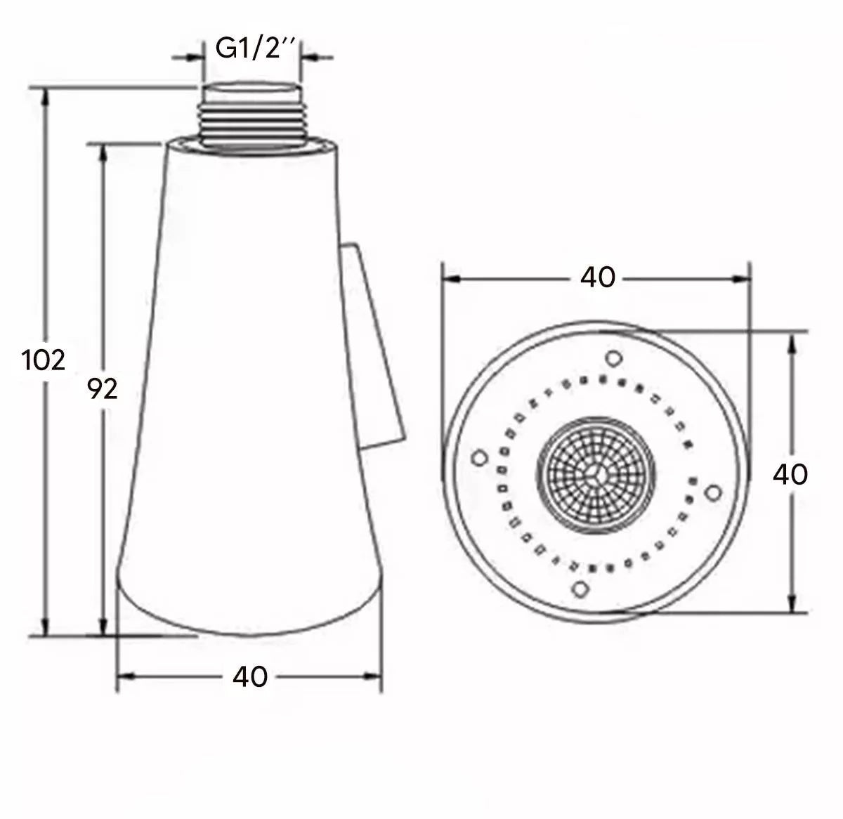 Medžiaga: PP plastikas.Leistinas vandens slėgis: 8 barai.Montavimas: maišytuvas su M22 išoriniu sriegiu.Ilgis: 10,2 cm.Skersmuo (sriegis): 2,2 cm.Skersmuo (burnos): 4,0 cm.Spalva: Sidabrinė.