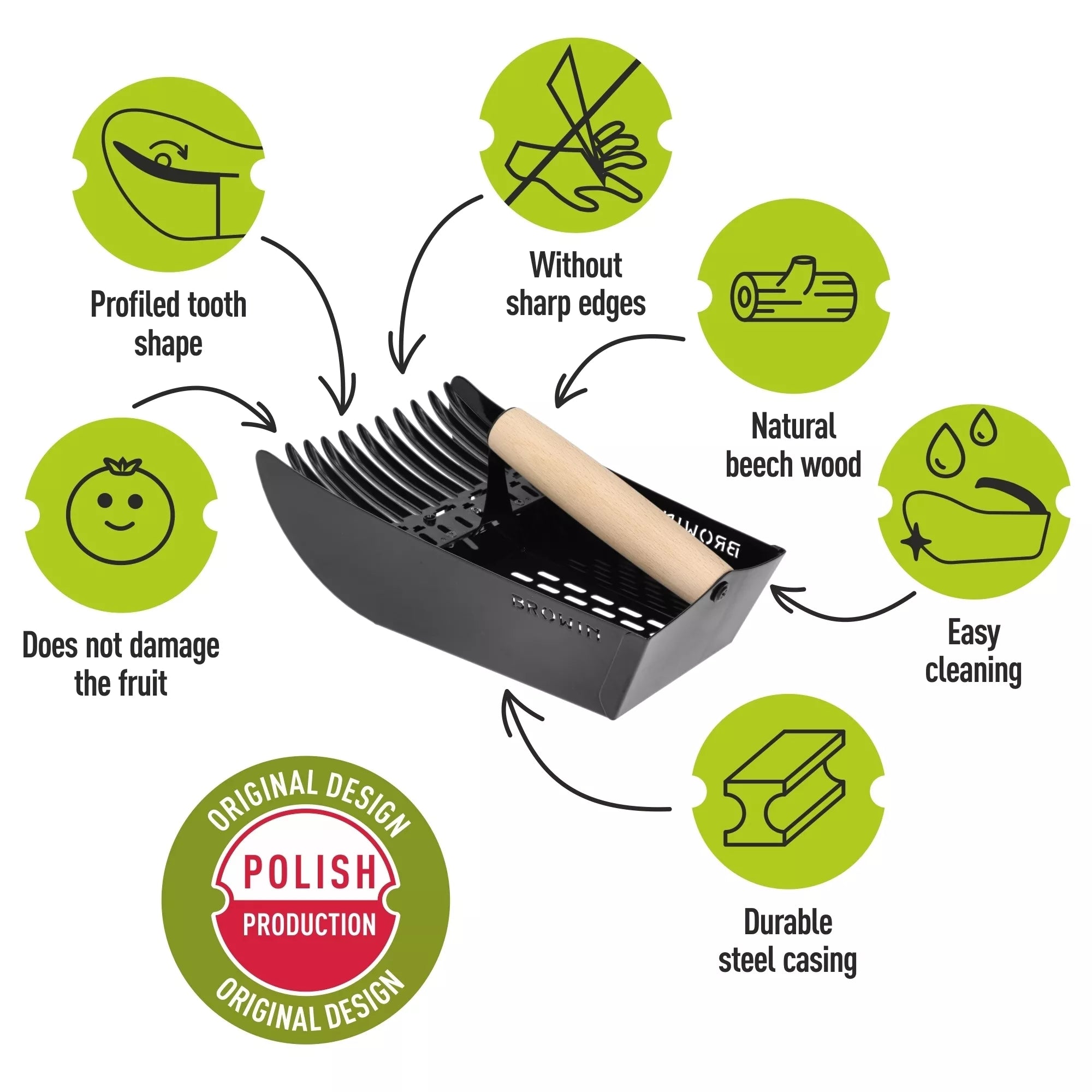 Tobulas smulkių vaisių skynimas – naudodamiesi šiuo praktišku skintuvu, patogiai ir lengvai skinsite mėlynes, šilauoges, serbentus, aronijas ir kitus smulkius vaisius, kuriuos auginate.Naudojimo patogumas – skintuvas sukurtas galvojant apie jūsų komfortą: ergonomiška, optimizuota forma, patogi rankena, „kvėpuojanti“ apačia (dėl perforacijos), tinkamas plotis ir didelė talpa.Aukšta kokybė ir elegancija – įvertinsite patvarų plieninį korpusą, padengtą blizgia danga, tvirtą medinę rankeną bei harmoningą viso įrankio formą.Saugumas vaisiams ir krūmams – tinkamai suformuoti lankstūs šukos dantukai ir aštrių briaunų nebuvimas sumažina vaisių ir krūmų pažeidimo riziką.Lengvas valymas – dėl konstrukcijos privalumų skintuvą greitai ir lengvai išvalysite.Originalus dizainas, pagaminta Lenkijoje – funkcionalumo ir patrauklaus dizaino derinys.Tinkamai naudojamas šis skintuvas tarnaus jums daugelį metų. Juo galėsite surinkti daugiau vaisių vienu kartu. Naudojimo patogumas, patvarumas, atsparumas rūdims, išskirtinė ir kompaktiška forma – tai tik dalis šio profesionalaus įrankio privalumų, kuriuos įvertinsite praktiškai.