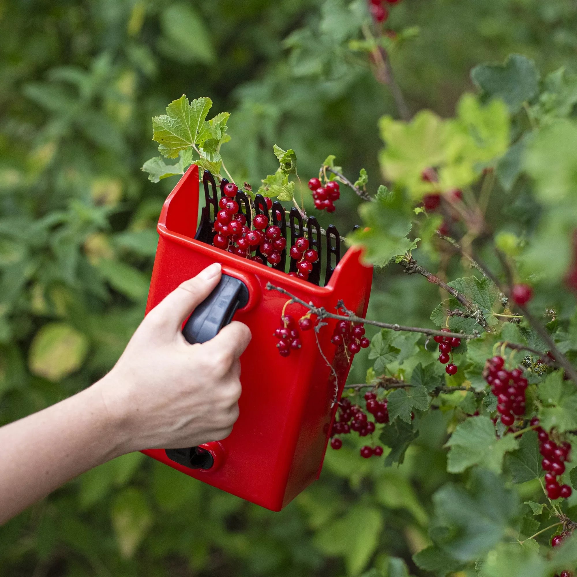 - Unikali konstrukcija – dėl specialios konstrukcijos nuskintos uogos neiškrenta iš įrenginio, o talpą galima ištuštinti tik pakėlus apatinį dangtelį.