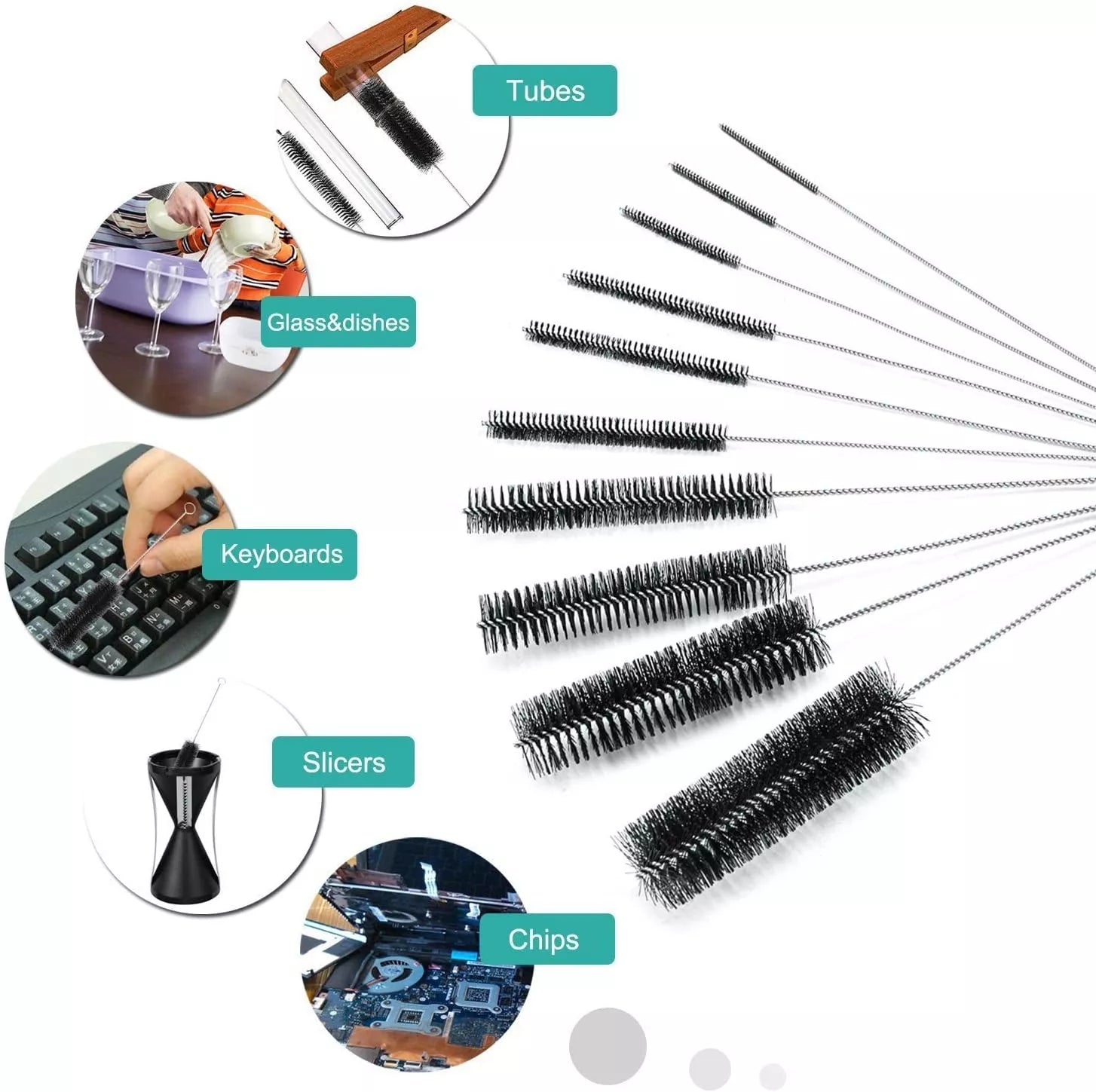 Šis šepetėlių rinkinys yra geriausias buteliams ir stikliniams indams valyti: nuo vyno/ alaus butelių, vazų, metalinių butelių, vyno taurių iki kūdikių buteliukų.