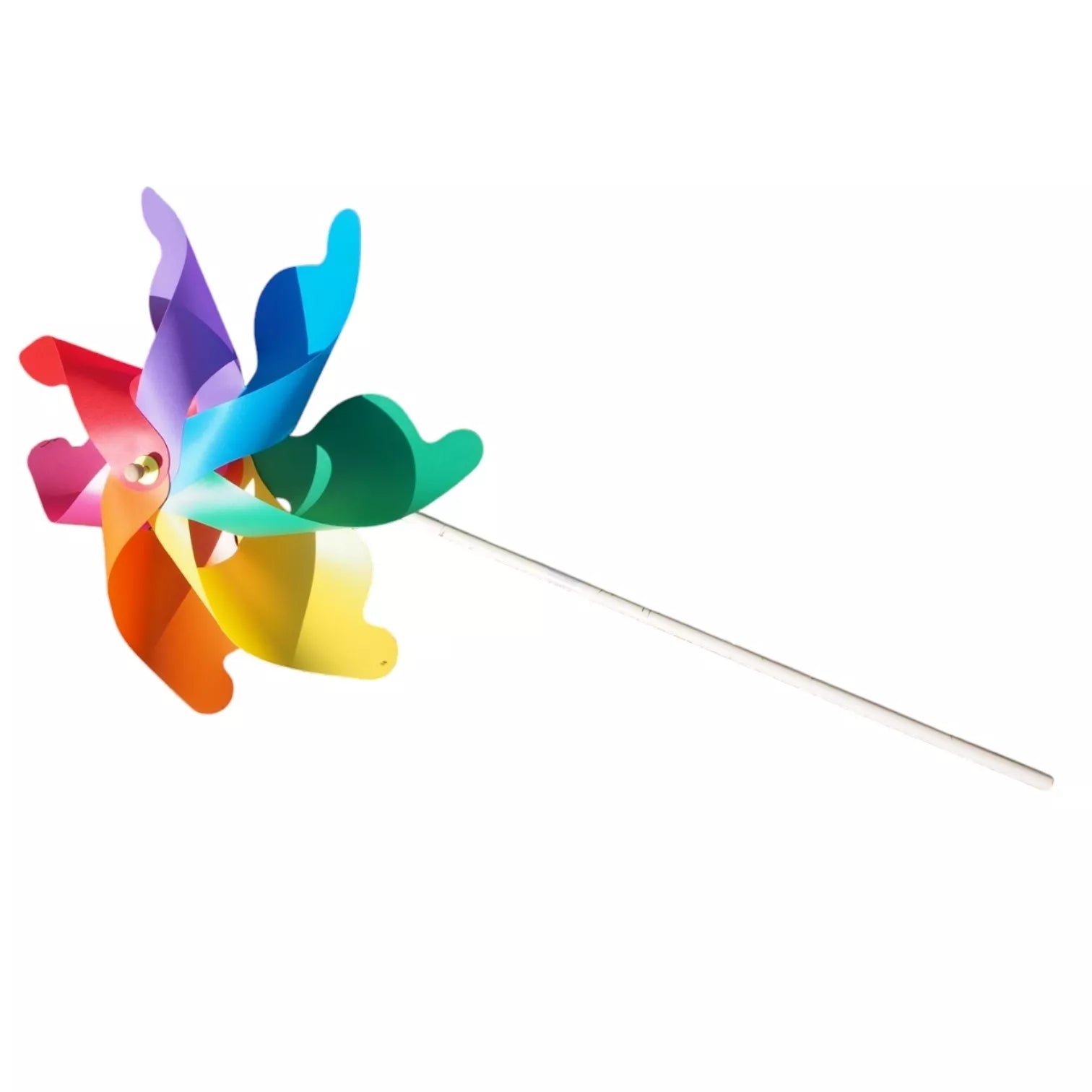 Spalvingas vėjo malūnėlis su mediniu kotu – žaismingas akcentas vaikams ir aplinkos dekorui!