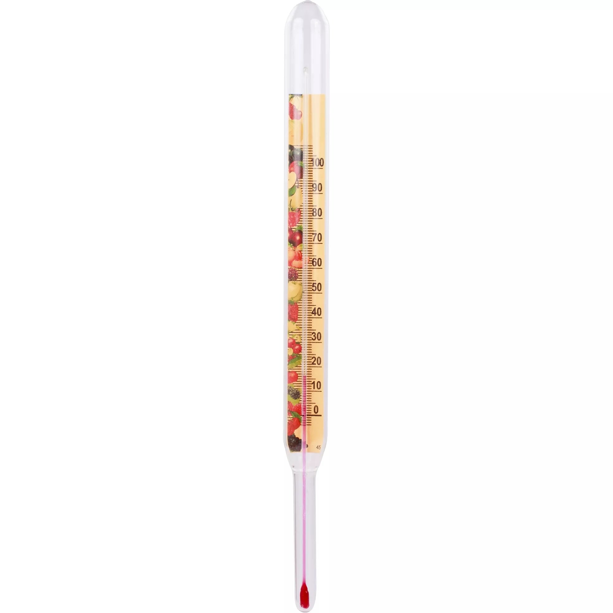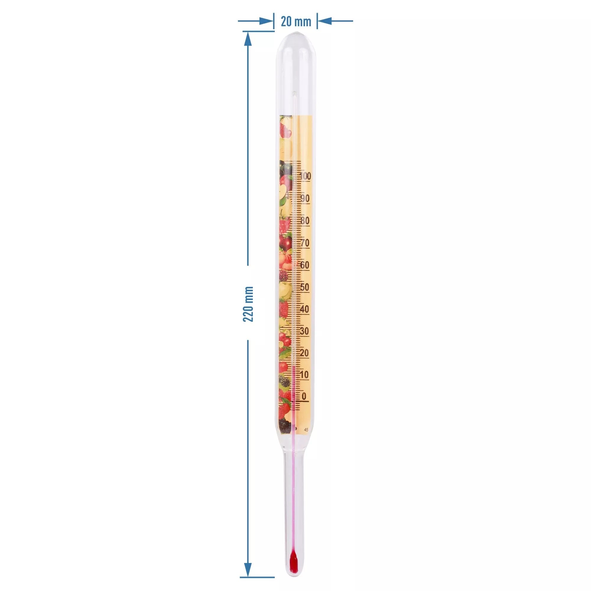 Didelis ir patogus 22 cm termometras yra priedas, kuris turi būti jūsų virtuvėje! Šis prietaisas, skirtas temperatūros stebėjimui gaminant naminius konservus, pasterizuojant ir plaunant mėsą, palengvins kasdienius virtuvės darbus! Produktas yra 100% pagamintas Lenkijoje ir pasižymi aukšta kokybe bei patikimumu. Tai skysto pagrindo termometras, kuriame nėra gyvsidabrio, todėl jį galite saugiai ir lengvai naudoti gamindami maistą, nesijaudindami dėl sąlyčio su pavojinga medžiaga jį sugedus. Aukštos kokybės skaidrus stiklas ir skalė nuo 0 iki 100°C leis tiksliai nustatyti temperatūrą. Be to, spalvota įskaitoma skalė su vaisių motyvais padės nuskaityti išmatuotą vertę bet kokiomis sąlygomis. Priemonę labai lengva prižiūrėti ir valyti – užtenka išplauti šiltame tekančiame vandenyje.