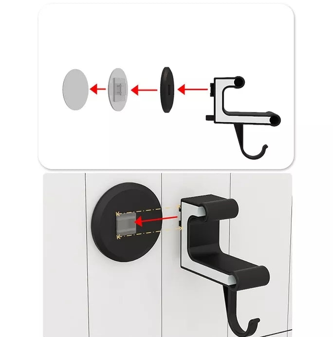 Montuojant nereikia daryti skylių sienoje, todėl siena nepažeidžiama ir palengvina montavimą.Medžiaga metalas-plastikas.Su kabliukais.Prilimpa dvipusės juostelės pagalba.