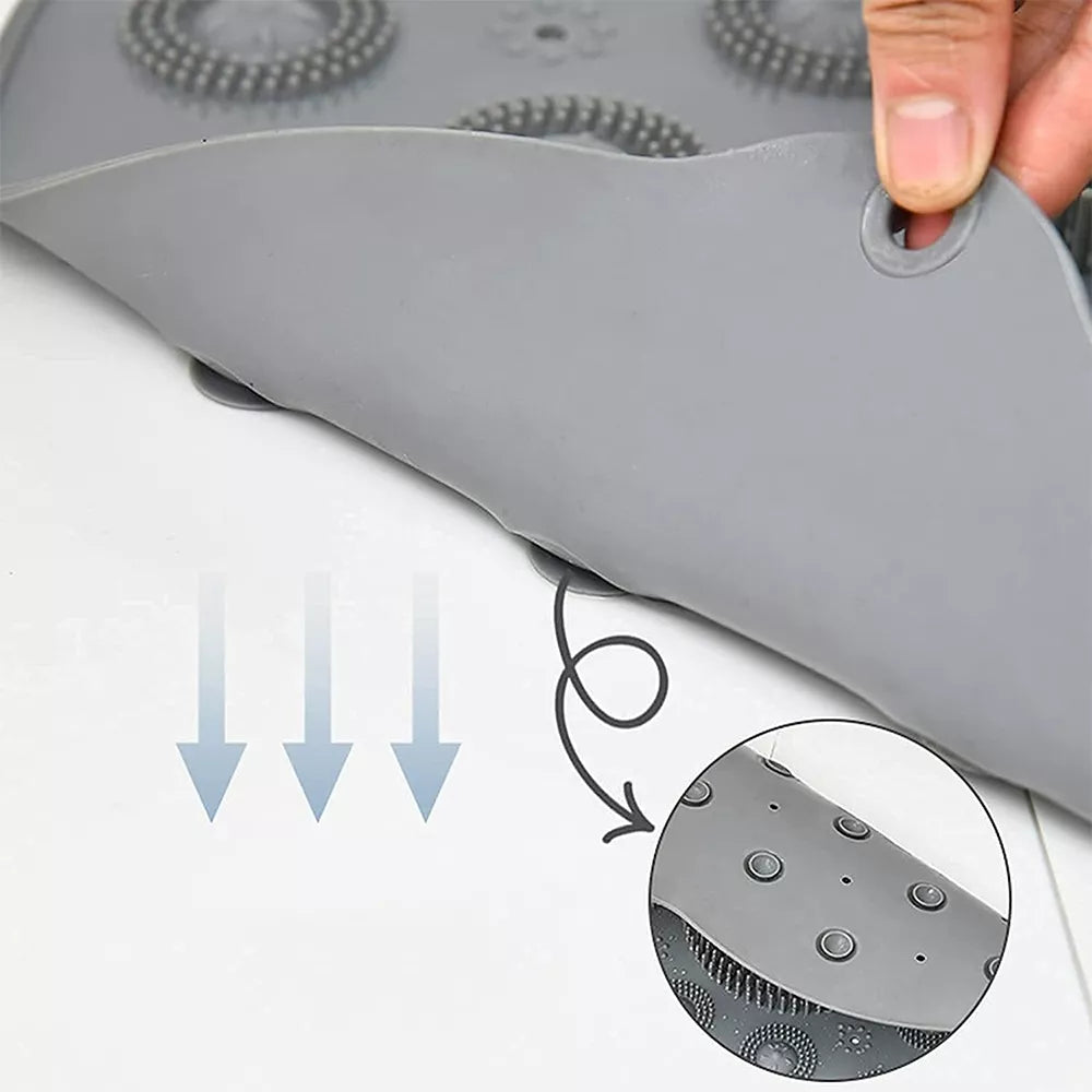 Silikoninis vonios kambario kilimėlis prausimuisi ir nugaros masažui. Įrengtos specialios plauką primenančios masažinės iškyšos. Tai tikrai palengvina nugaros masažą ir plovimą. Produktas pagamintas iš odai saugios medžiagos. Kilimėlį galima sterilizuoti virintame vandenyje ir plauti indaplovėje. Specialūs išsikišimai nugaroje leidžia pritvirtinti poveržlę prie sienos.