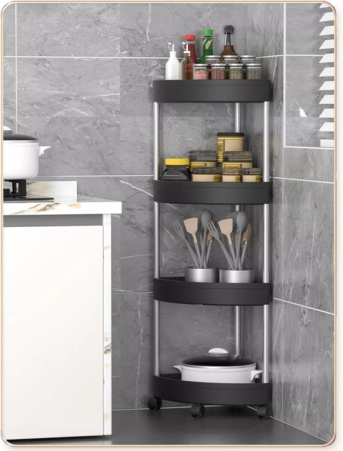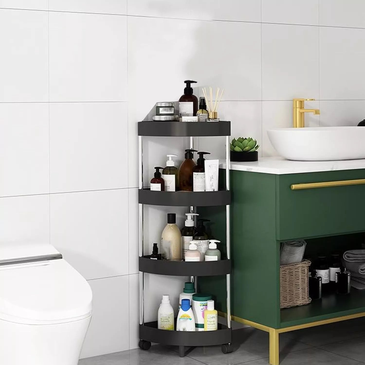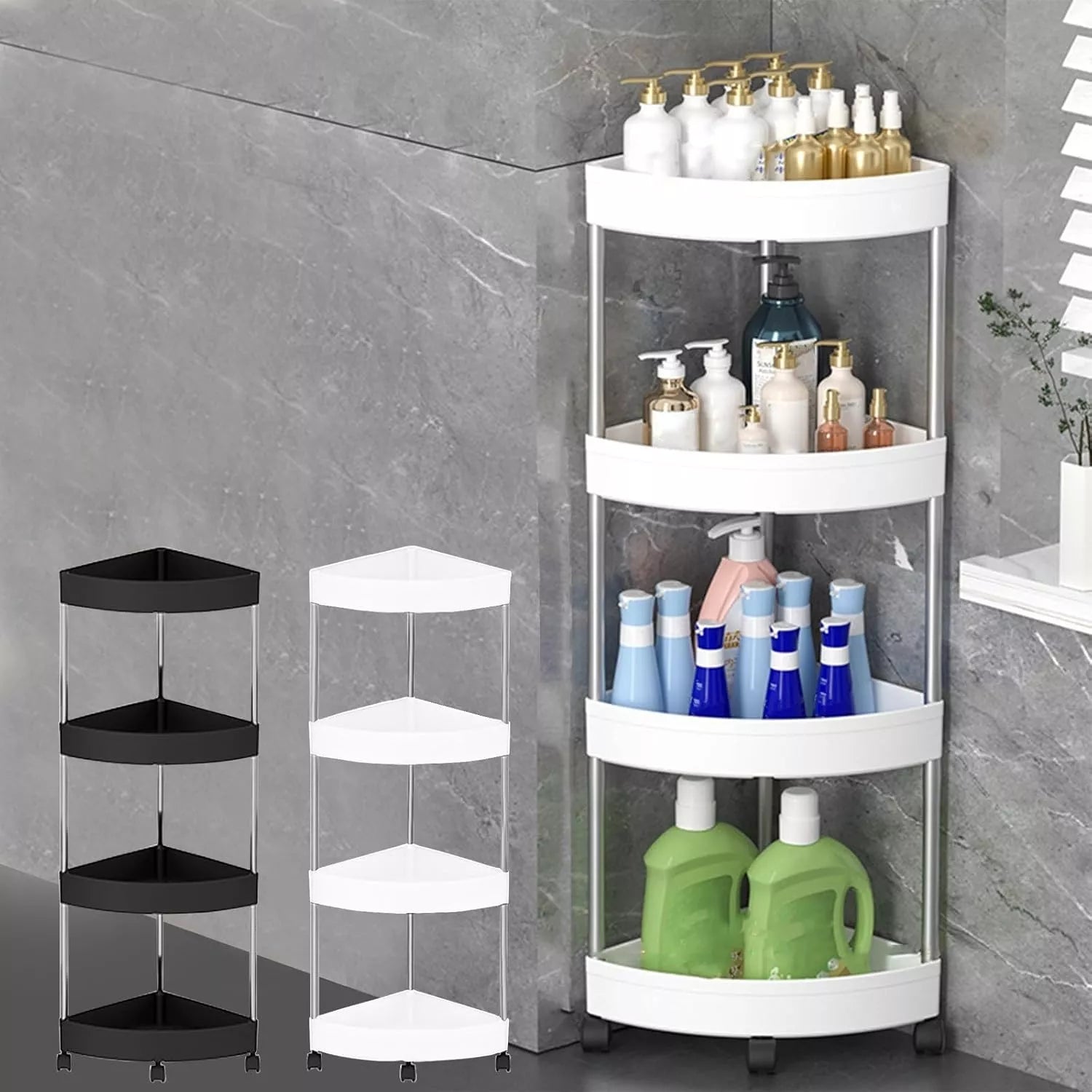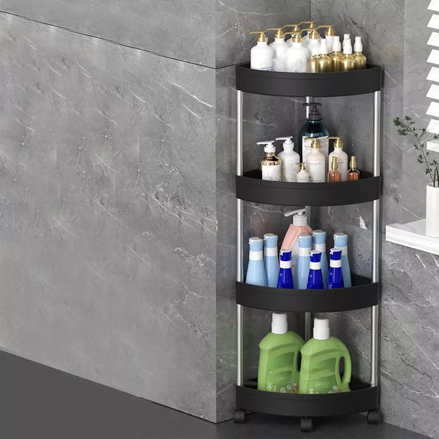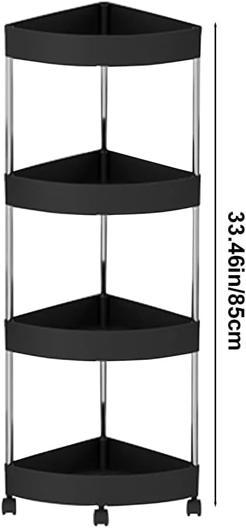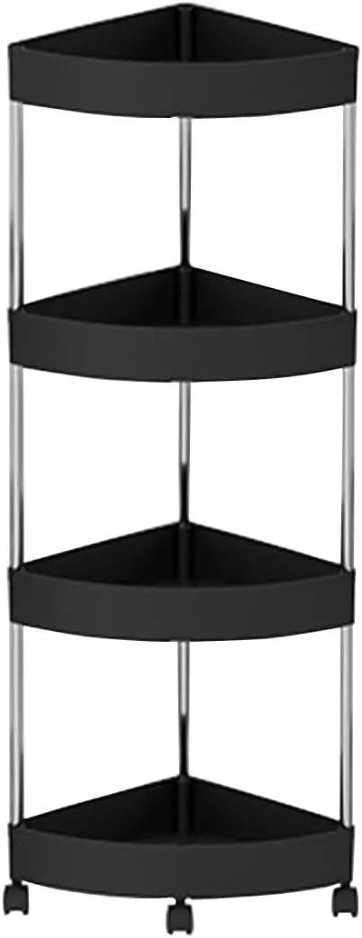 Šis kampinis 4 lygių stelažas – tai funkcionalus ir stilingas sprendimas, skirtas efektyviai išnaudoti kampines erdves vonios kambaryje, virtuvėje ar bet kurioje kitoje patalpoje. Dėl kompaktiško trikampio dizaino jis puikiai tinka net mažose patalpose, o mobilūs ratukai leidžia lengvai perstumti stelažą į norimą vietą.