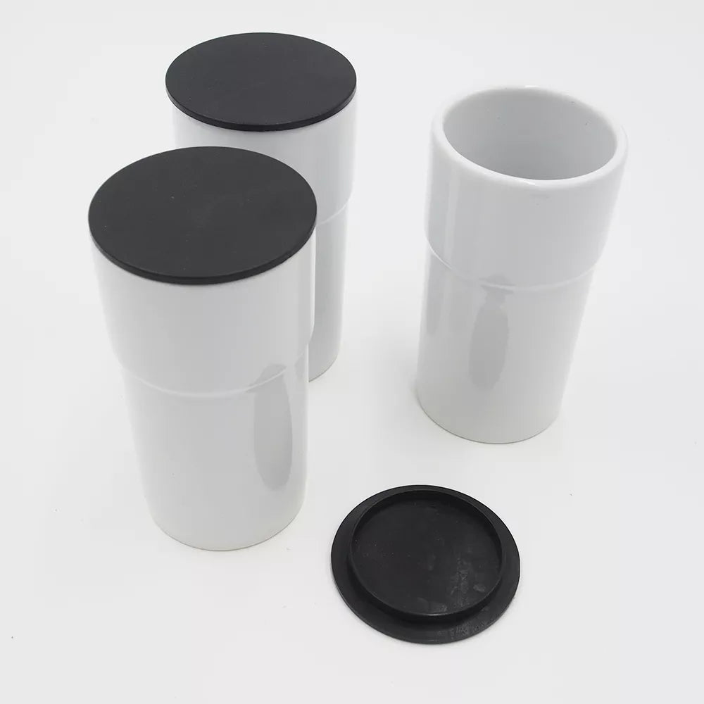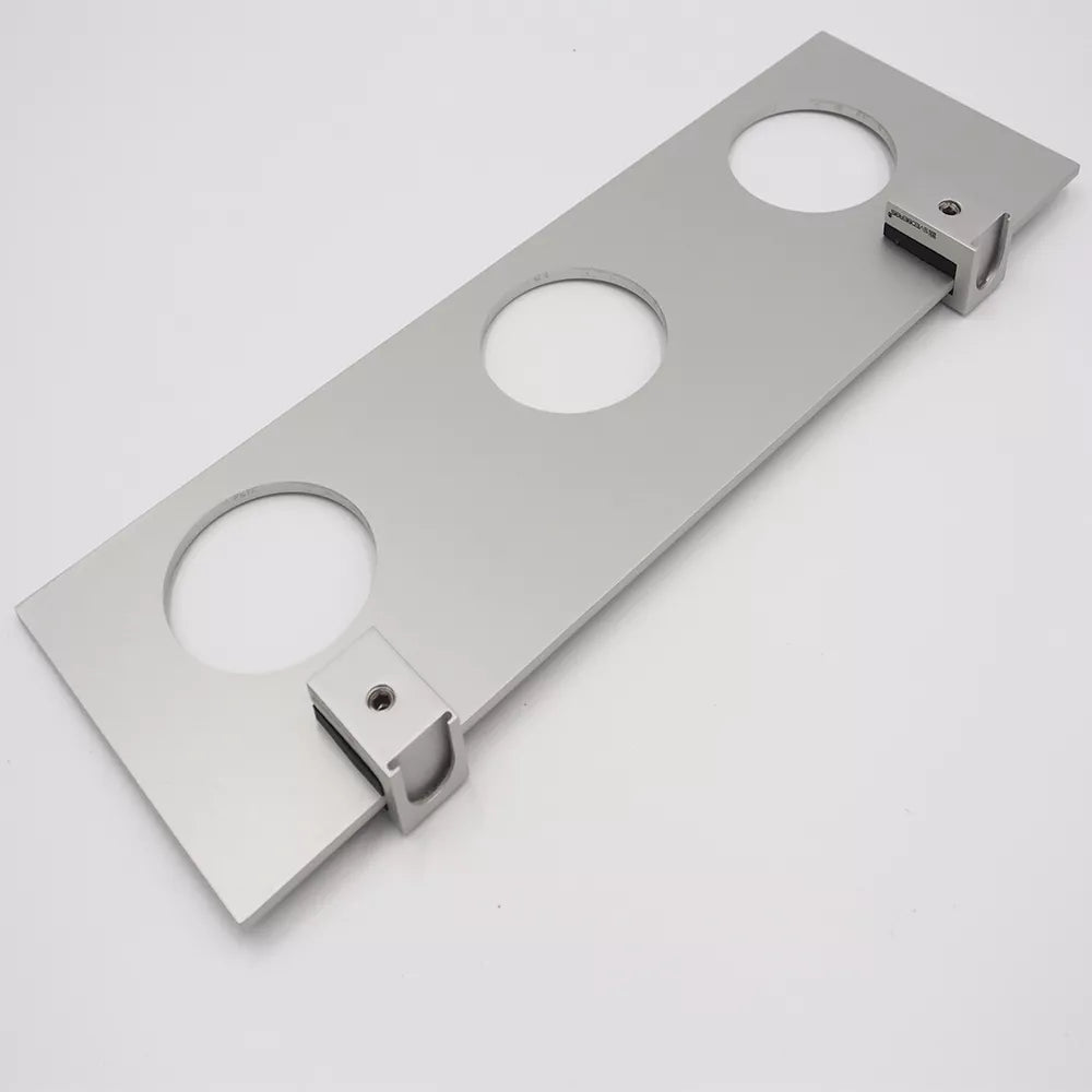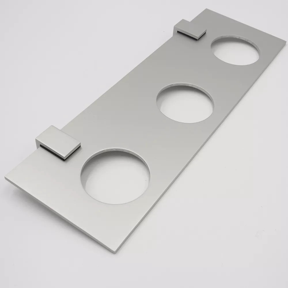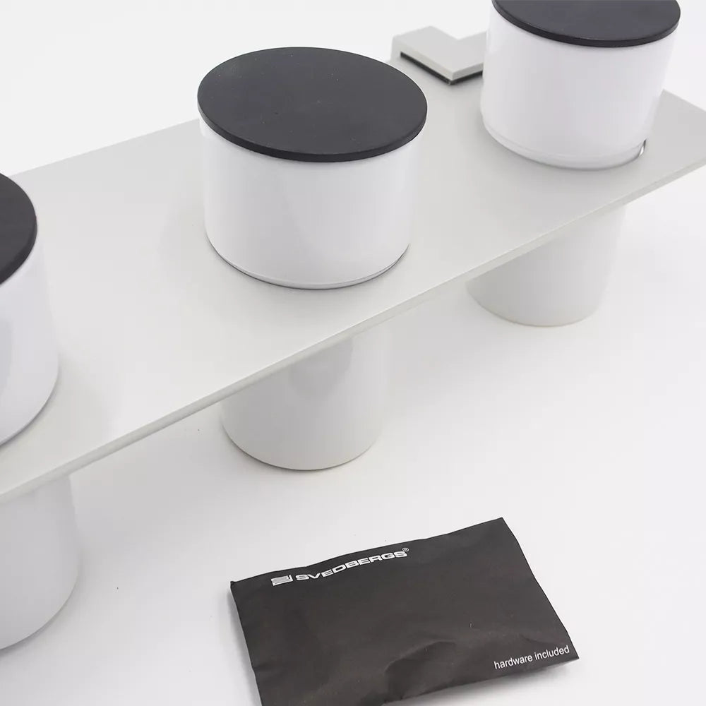 Modernaus dizaino detalė vonioje.3 vnt. keramikiniai, balti puodeliai su plastikiniais dangteliais.Laikiklis pagamintas iš aliuminio (pridedami tvirtinimo varžtai).Išmatavimai lentynėlė: 36X12X0.4 cm.Išmatavimai puodelis: 63X123mm.