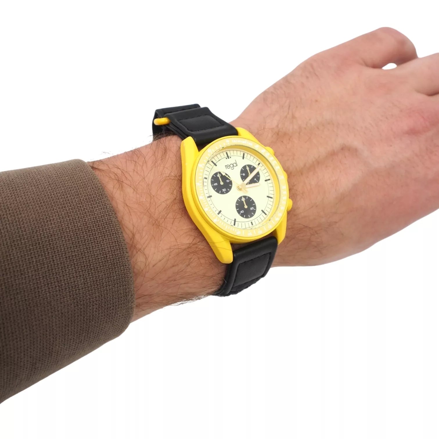 Stilingas ir modernus vyriškas laikrodis, kuris išsiskiria savo ryškiu dizainu. Geltonas korpusas suteikia laikrodžiui išskirtinumo, o juodas odos imitacijos dirželis užtikrina patogumą ir elegantišką išvaizdą. Šviesus ciferblatas su trimis dekoratyviniais mini ciferblatais bei tachometro žymėjimu suteikia sportišką įvaizdį ir tinka tiek kasdieniam dėvėjimui, tiek ypatingoms progoms.