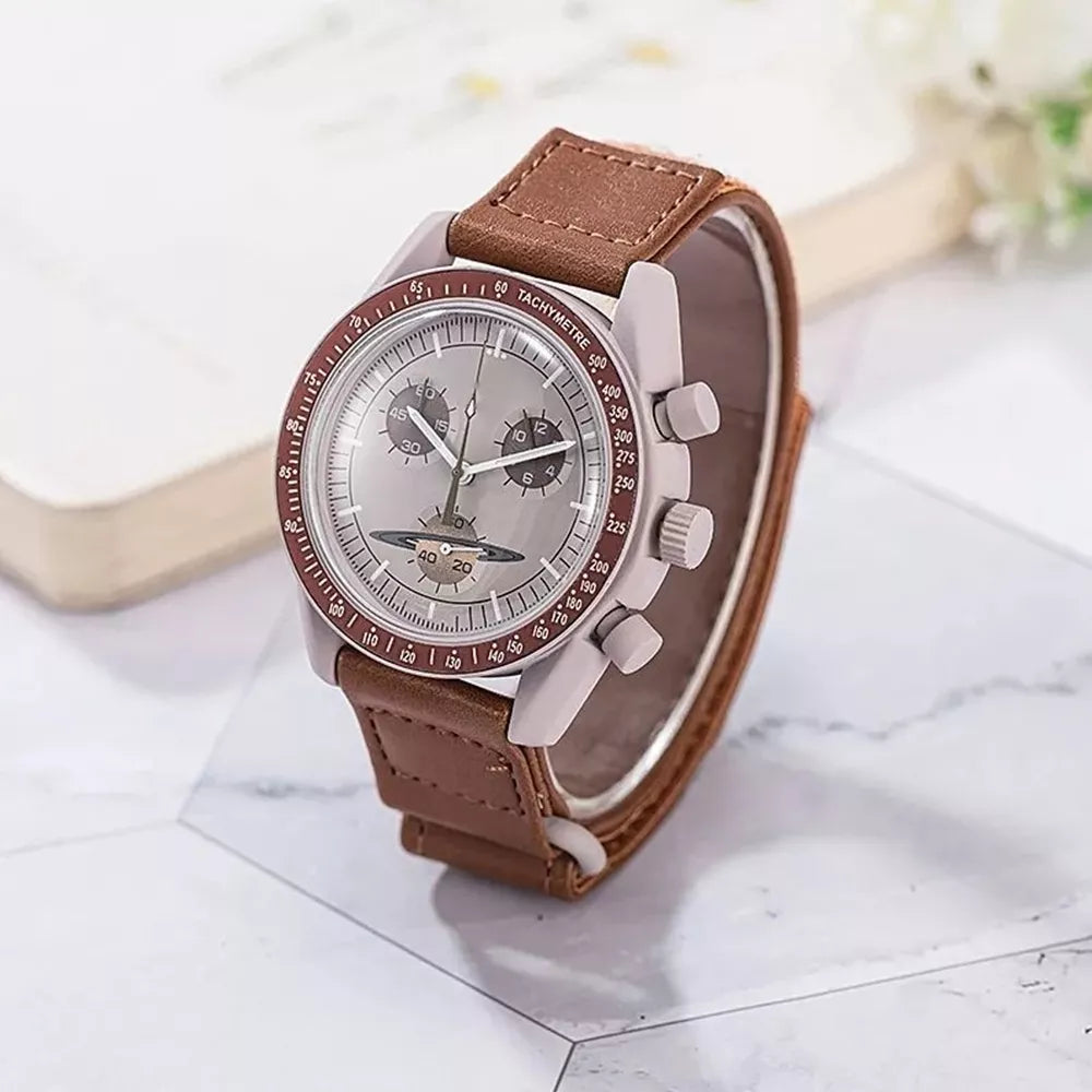 Stilingas ir patogus vyriškas laikrodis kasdieniam naudojimui. Klasikinis dizainas derinamas su šiuolaikiškais akcentais – baltas ciferblatas su papildomais dekoratyviniais indikatoriais ir ruda odos imitacijos diržele su tvirtu užsegimu.